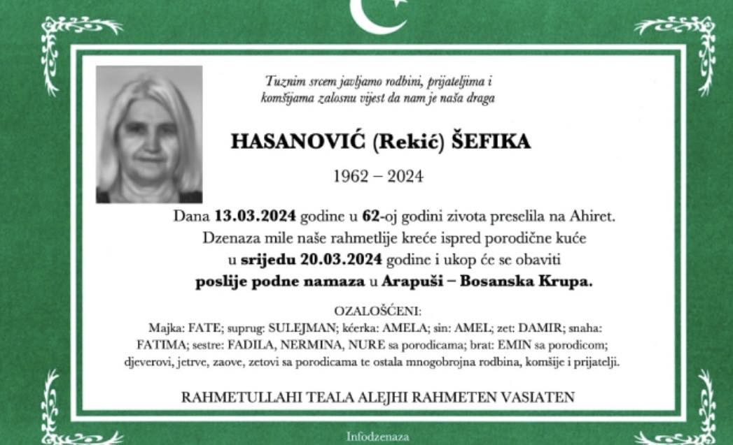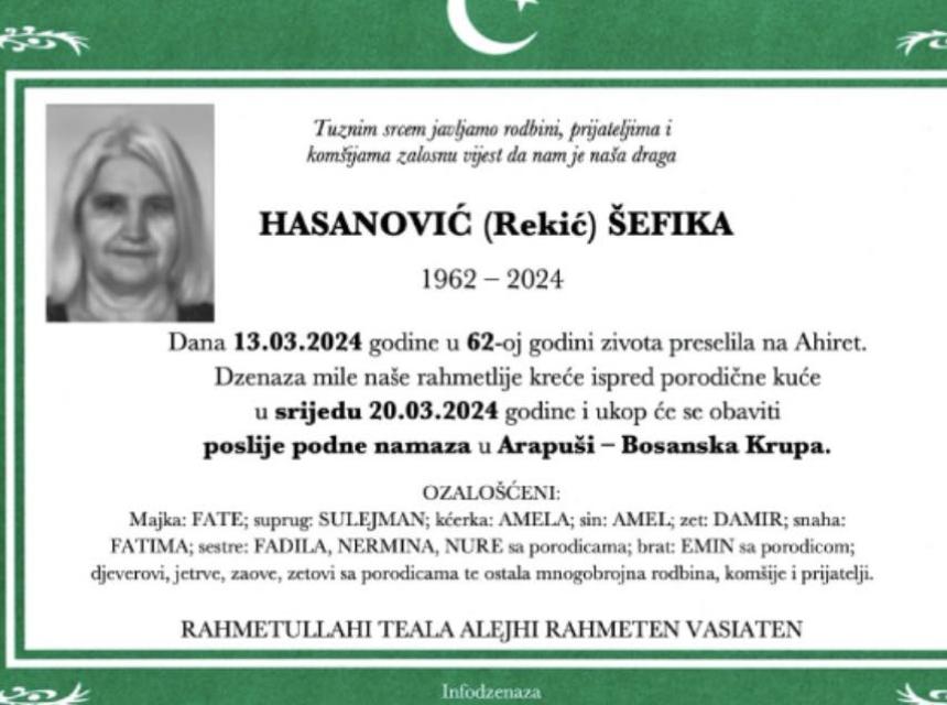 Tužnim srcem javljamo rodbini, prijateljima, komšijama i poznanicima žalosnu vijest da nam je naša draga Hasanović (Rekić) Šefika dana 13.03.2024. godine u 62. godini života preselila na Ahiret.