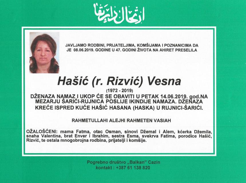 Sa žalošću javljamo rodbini, prijateljima i poznanicima da je dana 08. 06. 2019 godine u 47.oj godini života na Ahiret preselila naša draga Hašić (r. Rizvić) Vesna.