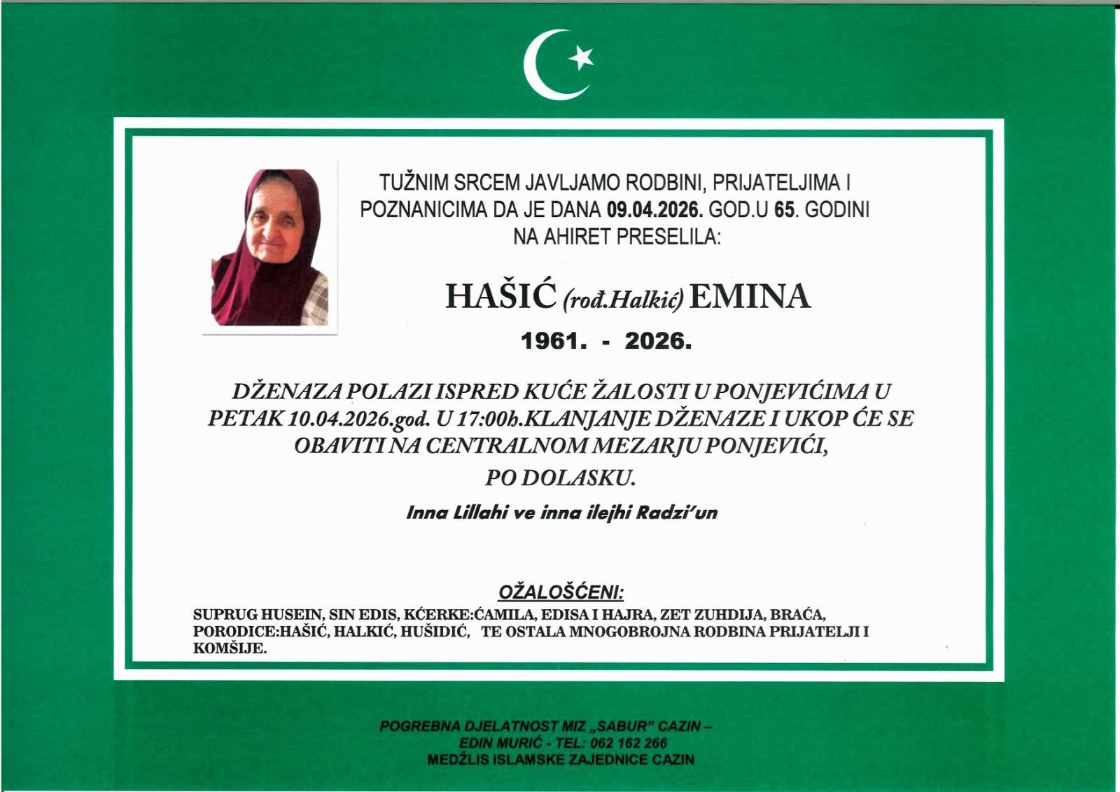 Dženaza polazi ispred kuće žalosti u Ponjevićima u petak 10.04.2026. godine u 17:00 sati. Klanjanje dženaze i ukop će se obaviti na centralnom mezarju Ponjevići, po dolasku.