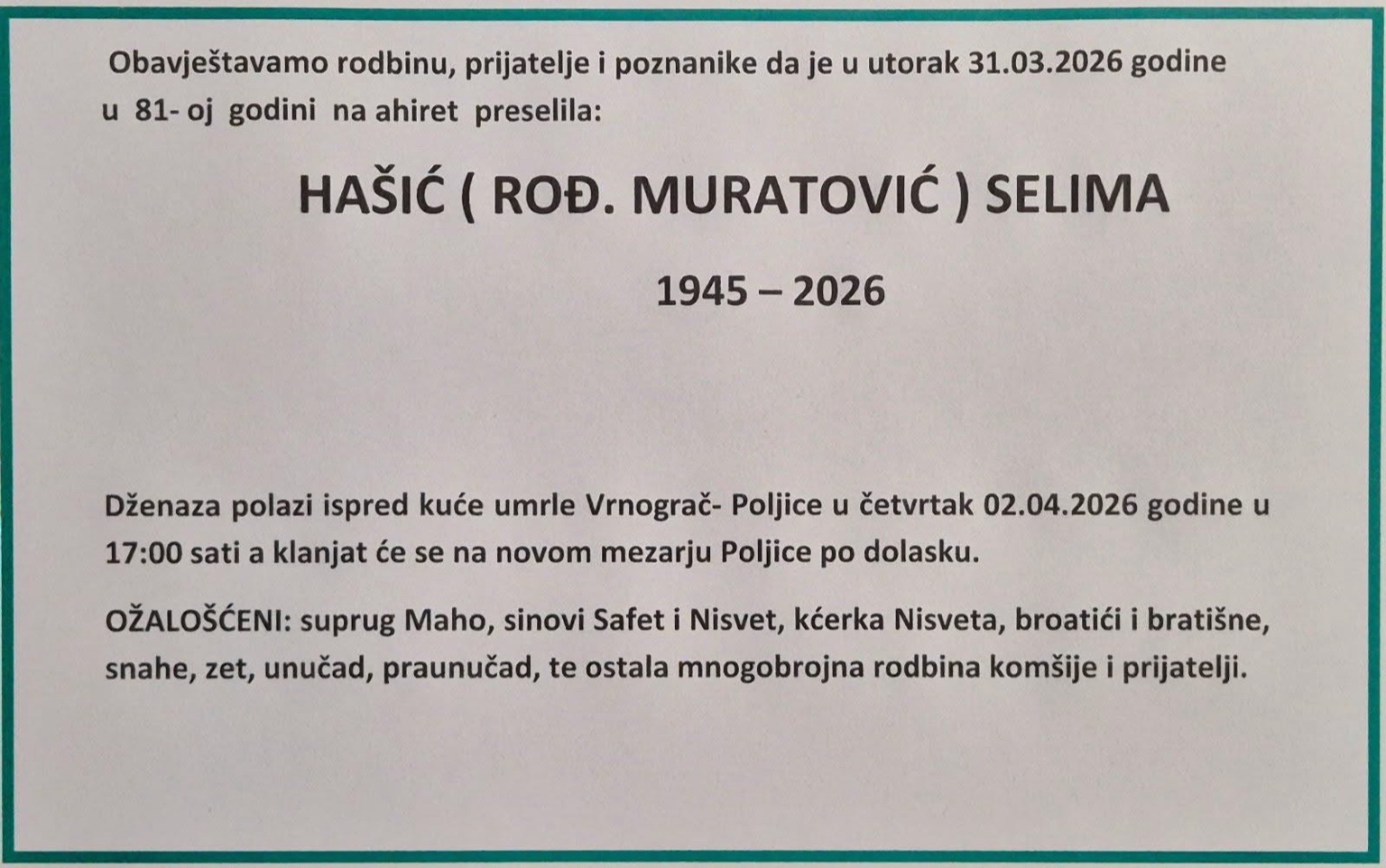 Dženaza polazi ispred kuće umrle Vrnograč - Poljice u četvrtak 02.04.2026 godine u 17:00 sati, a klanjat će se na novom mezarju Poljice po dolasku.