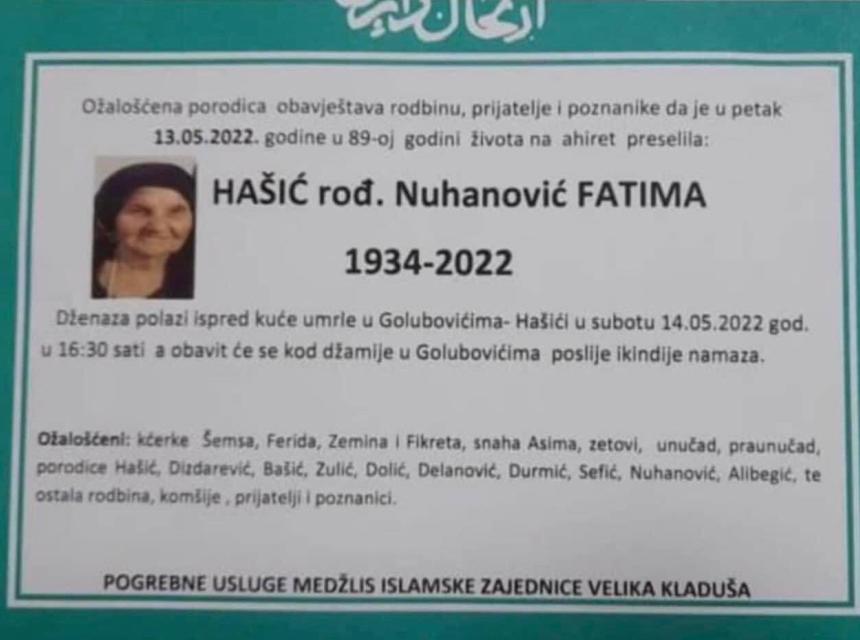 Tužnog srca i s bolom u duši obavještavamo rodbinu, komšije i prijatelje da je naša draga Hašić rođ. Nuhanović Fatima u 89. godini života preselila na Ahiret.
