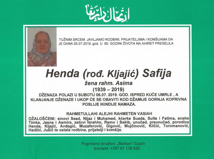 Tužnim srcem javljamo rodbini, prijateljima, komšijama i poznanicima da je dana 05.07.2019.godine u 80. godini života na Ahiret preselila Henda (rođ. Kljajić) Safija.