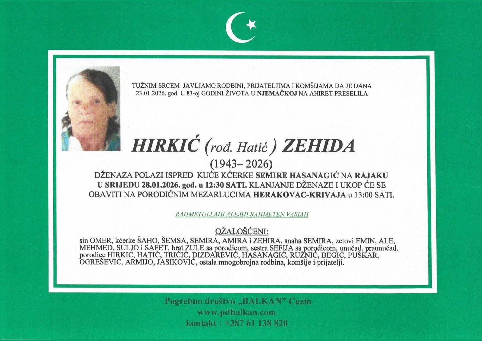 Dženaza polazi ispred kuće kćerke Semire Hasanagić na Rajaku u srijedu, 28. 01. 2026. godine, u 12:30 sati. Klanjanje dženaze i ukop obavit će se na porodičnim mezarlucima Herakovac – Krivaja u 13:00 sati.