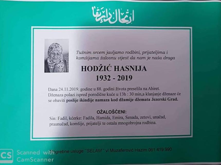Tužnim srcem javljamo rodbini, prijateljima i komšijama žalosnu vijest da nam je naša draga Hodžić Hasnija dana 24.11.2019. godine u 88. godini života preselila na Ahiret.