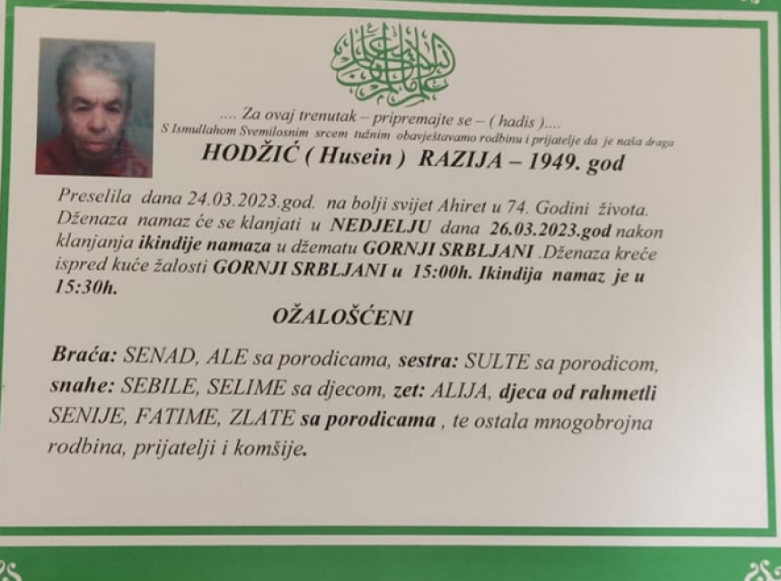 Dženaza namaz će se obaviti u nedjelju 26.03.2023. godine nakon ikindije namaza u džematu Gornji Srbljani. Dženaza kreće ispred kuće žalosti Gornji Srbljani u 15:00h. Ikindija namaz je u 15:30h