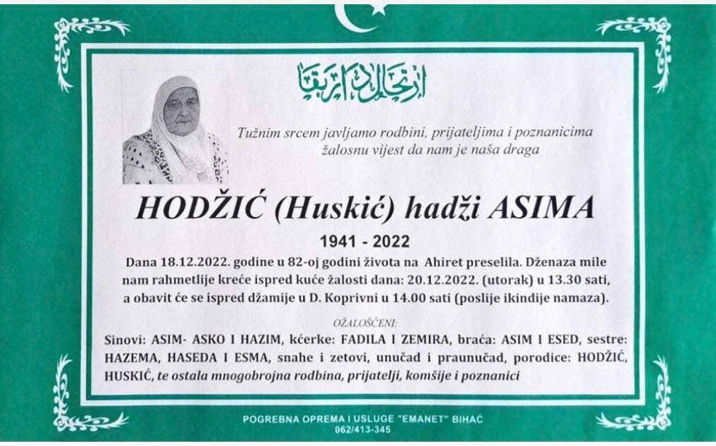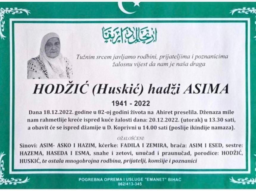 Tužnim srcem i bolom u duši javljamo rodbini, prijateljima i poznanicima da je naša draga Hodžić (Huskić) hadži. Asima dana 18.12.2022, u 82 godini života preselila na Ahiret.