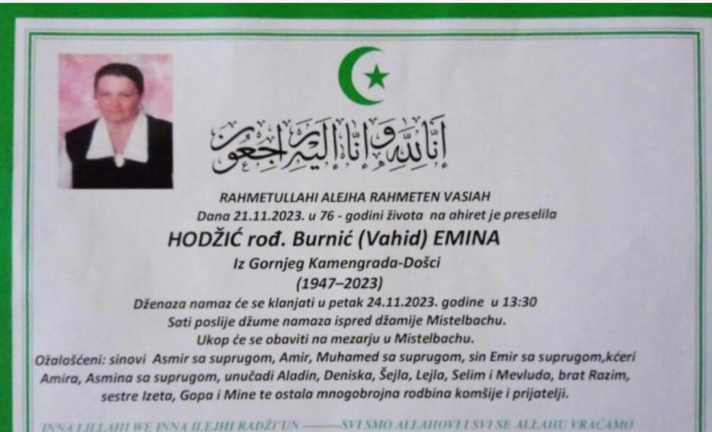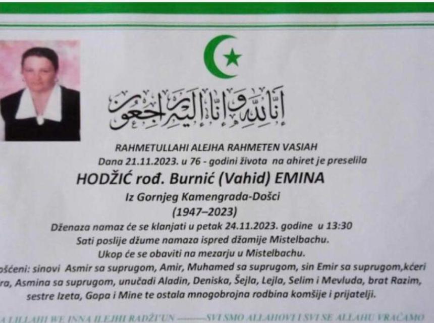 Tužnim srcem javljamo rodbini, prijateljima i komšijama da nam je naša draga Hodžić rođ. Burnić (Vahid) Emina na Ahiret preselila 21.11.2023.god. u 76-oj godini života.