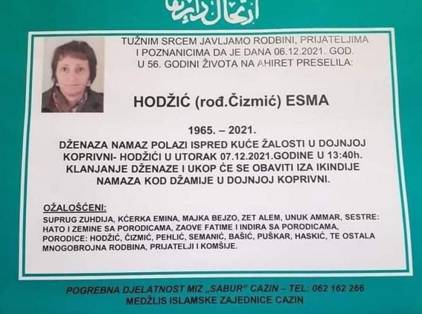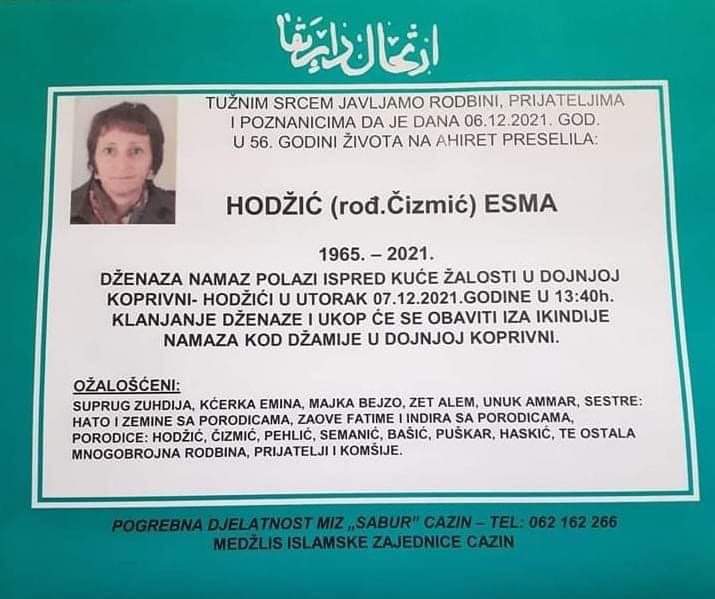 Tužnog srca i s bolom u duši obavještavamo rodbinu, komšije i prijatelje da je naša draga Hodžić (rođ. Čizmić) Esma dana 06.12.2021. u 56. godini života preselila na ahiret.