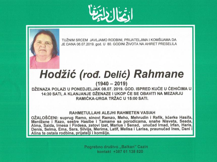 Tužnim srcem javljamo rodbini, prijateljima i komšijama da je dana 06.07.2019. god. u 80. godini života na Ahiret preselila Hodžić (rođ. Delić) Rahmane.