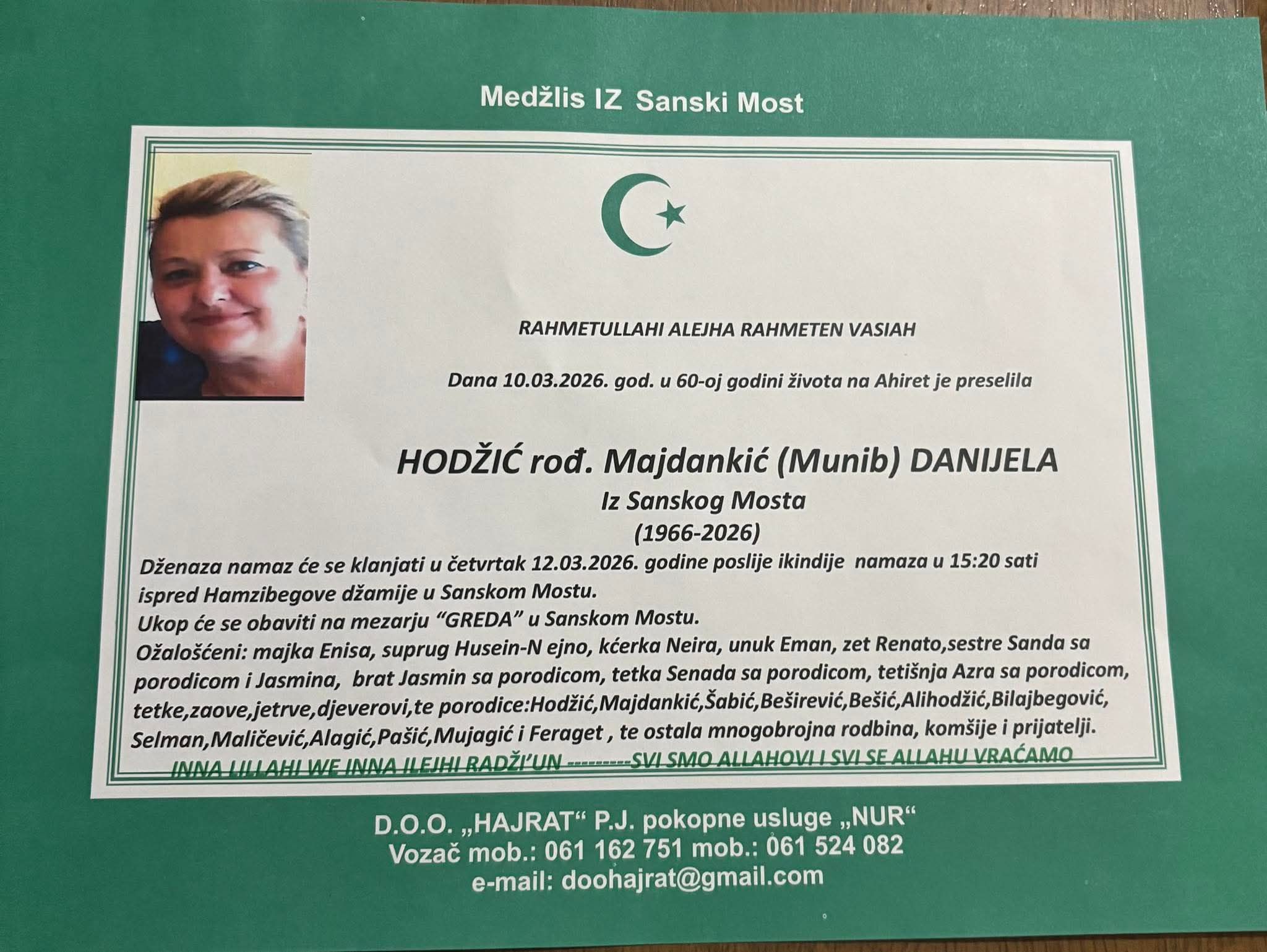 Dženaza namaz će se klanjati u četvrtak 12.03.2026. godine poslije ikindije namaza u 15:20 sati ispred Hamzibegove džamije u Sanskom Mostu.