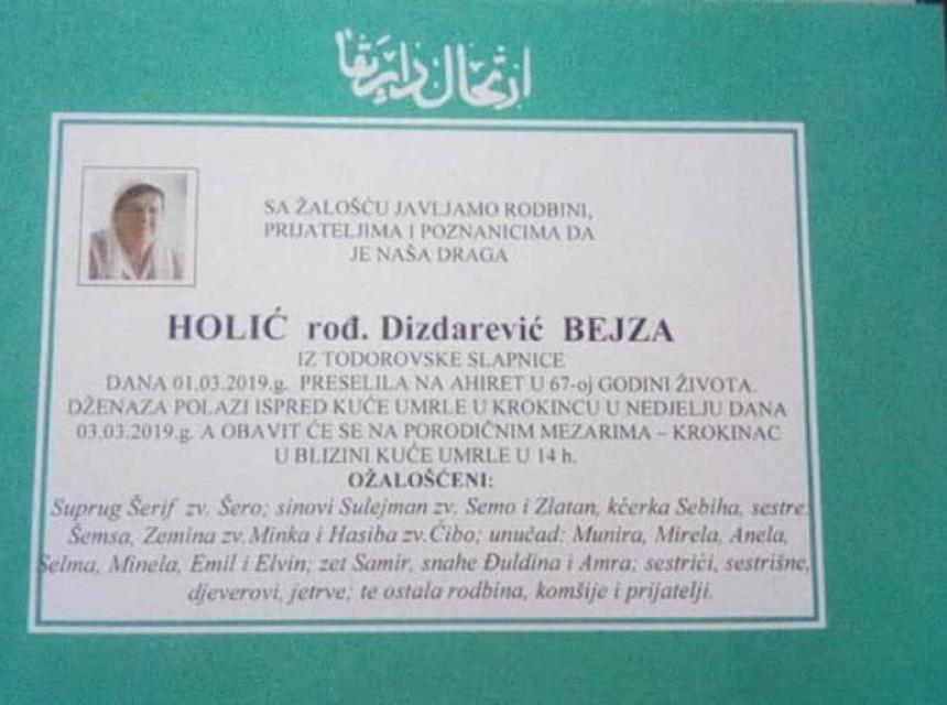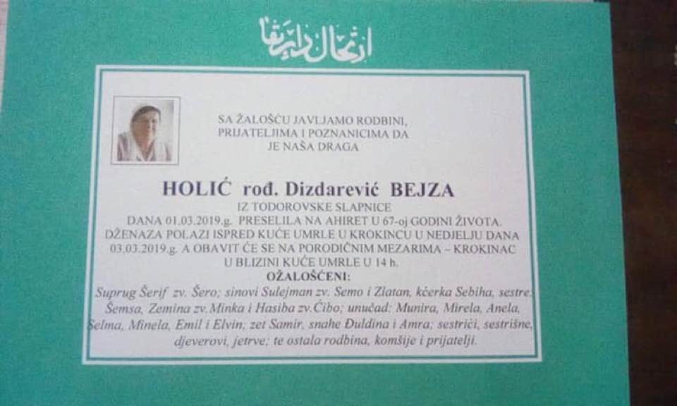 Tužnim srcem i bolom u duši, javljamo rodbini, komšijama i prijateljima, da je na Ahiret 01.03.2019.g. u 67.-oj godini života preselila Holić rođ Dizdarević Bejza.