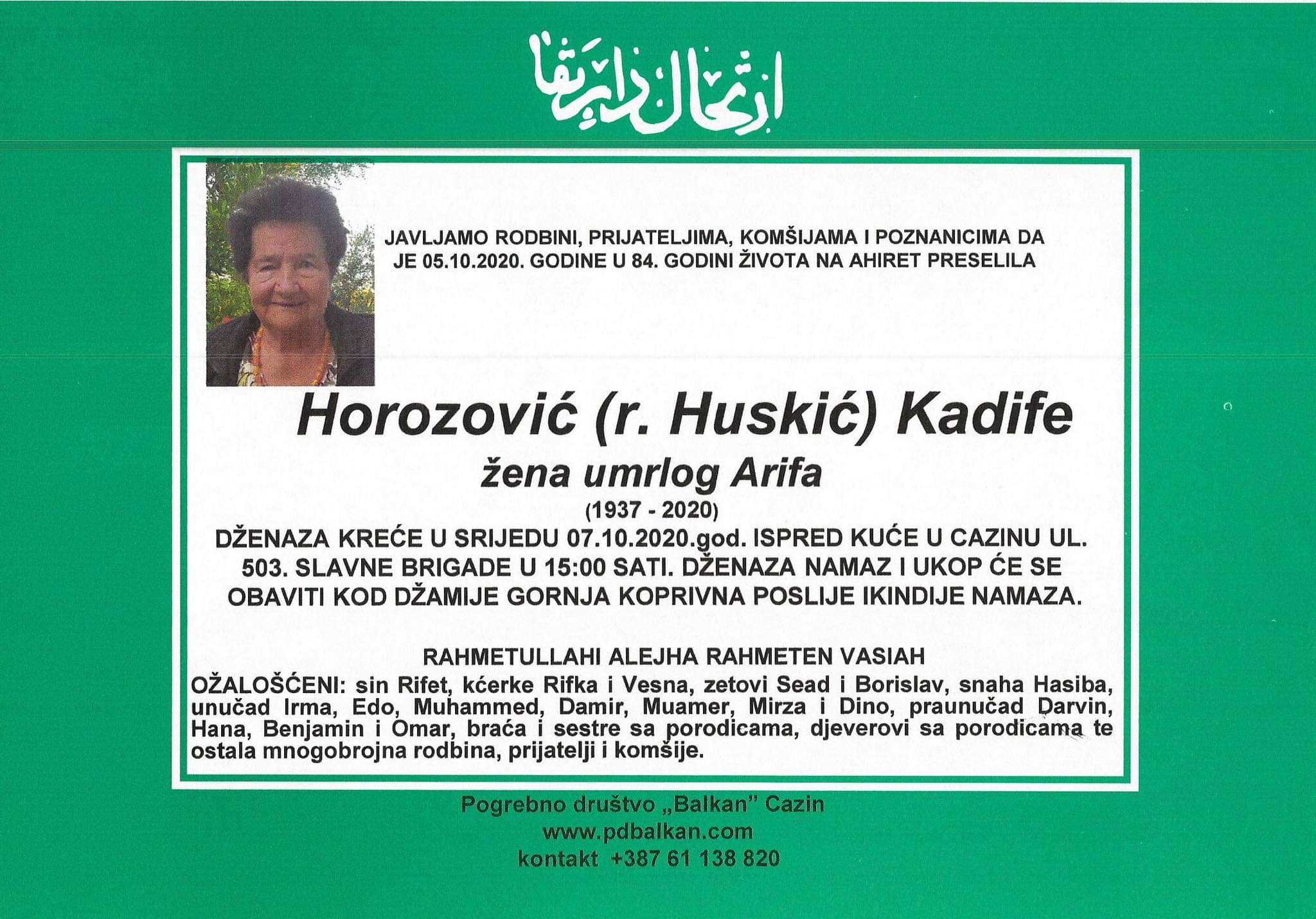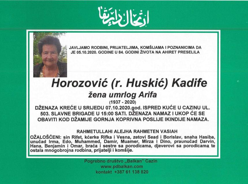 Tužnog srca i s bolom u duši obavještavamo rodbinu, komšije i prijatelje da je naša draga Horozović (r. Huskić) Kadife, dana 05.10.2020. godine, u 84-oj. godini života, preselila na Ahiret.