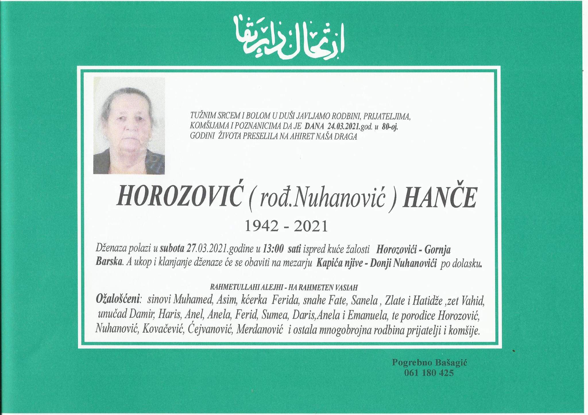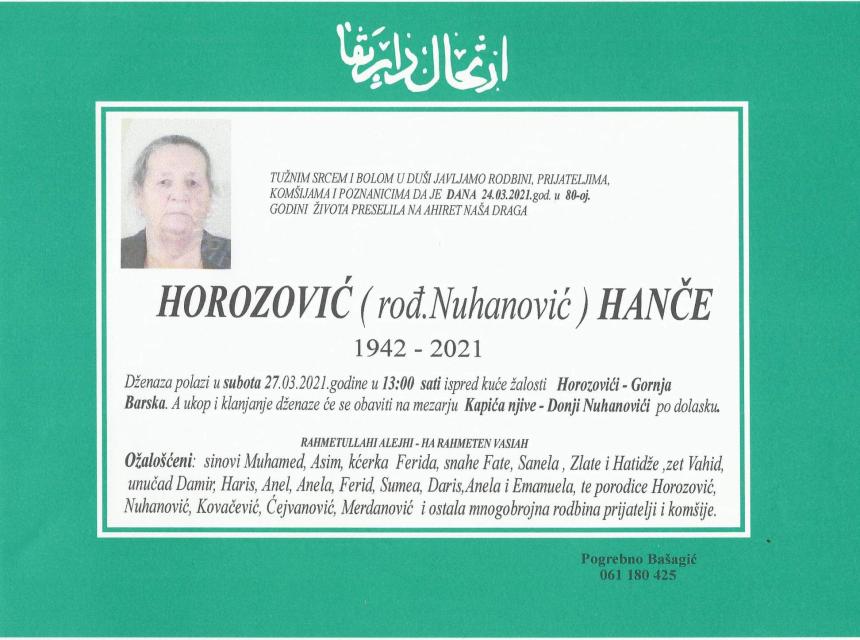 Tužnog srca i s bolom u duši obavještavamo rodbinu, komšije i prijatelje da je naša draga Horozović (rođ. Nuhanović) Hanče, dana 24.03.2021. godine, u 80-oj. godini života, preselila na Ahiret.