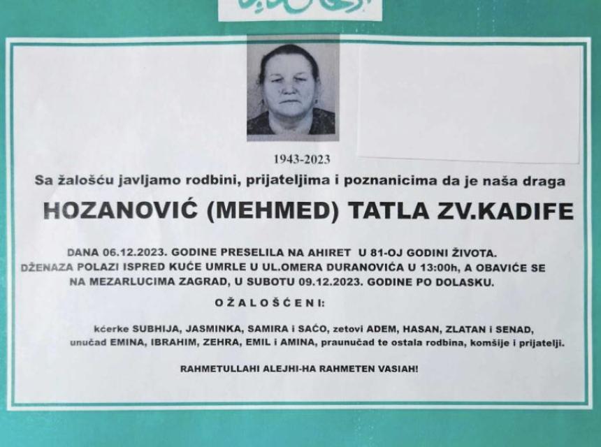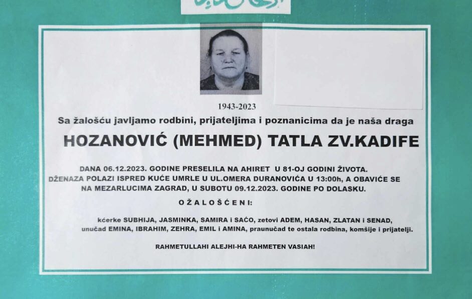 Obavjestavamo rodbin, prijatelje i komsije da je nasa draga Hozanović (Mehmed) Tatla zv. Kadife dana 06.12.2023.godine u 81-oj godini zivota preselila na Ahiret.