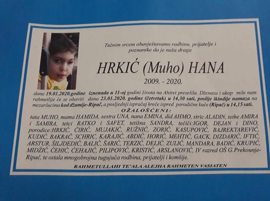 Tužnim srcem i bolom u duši javljamo rodbini i prijateljima da je naša draga Hrkić (Muho) Hana iznenada u 11. godini života preselila na Ahiret dana 19.01.2020. godine.