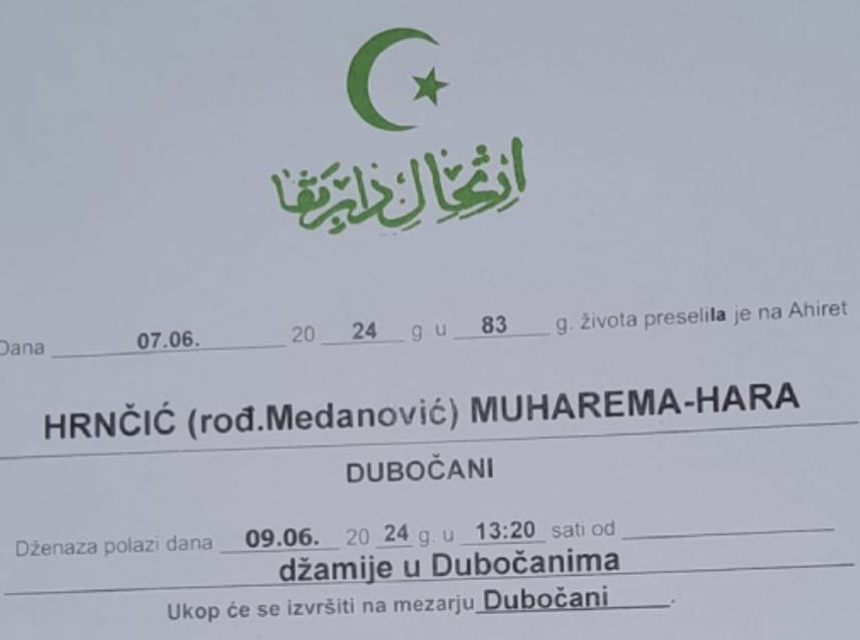 Tužnim srcem i bolom u duši javljamo rodbini, prijateljima i komšijama da je naša draga Hrnčić (rođ. Mehanović) Muharema-Hara dana 07.06.2024. godine u 83-oj godini života, preselila na Ahiret.