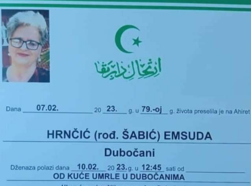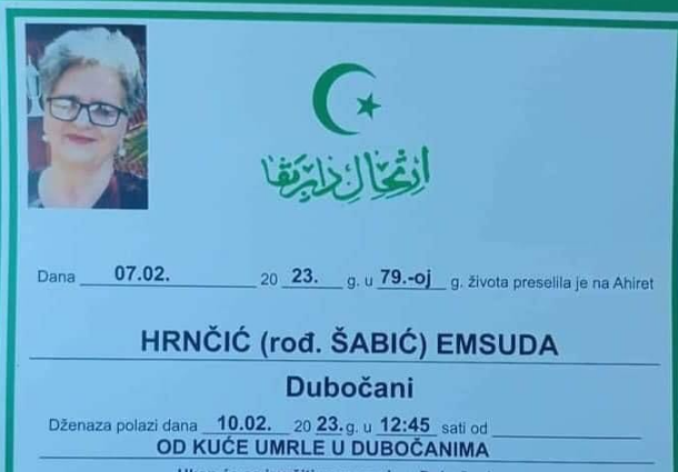 Tužnim srcem javljamo rodbini, prijateljima i komšijama tužnu vijest da nam je naša draga Hrnčić (rođ Šabić) Emsuda preselila na Ahiret dana 07.02.2023. godine u 79-oj godini života.