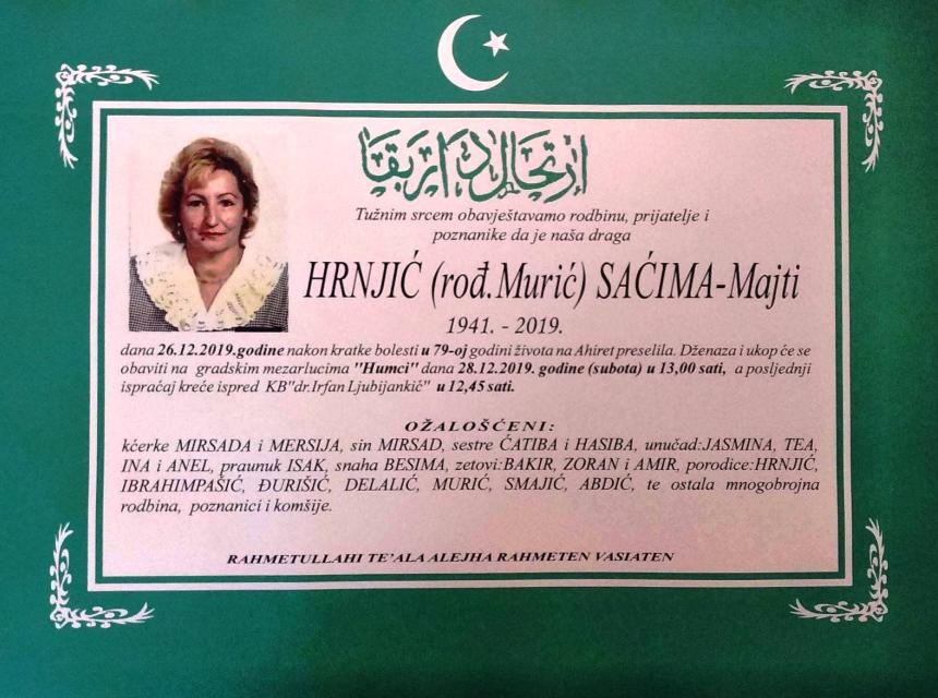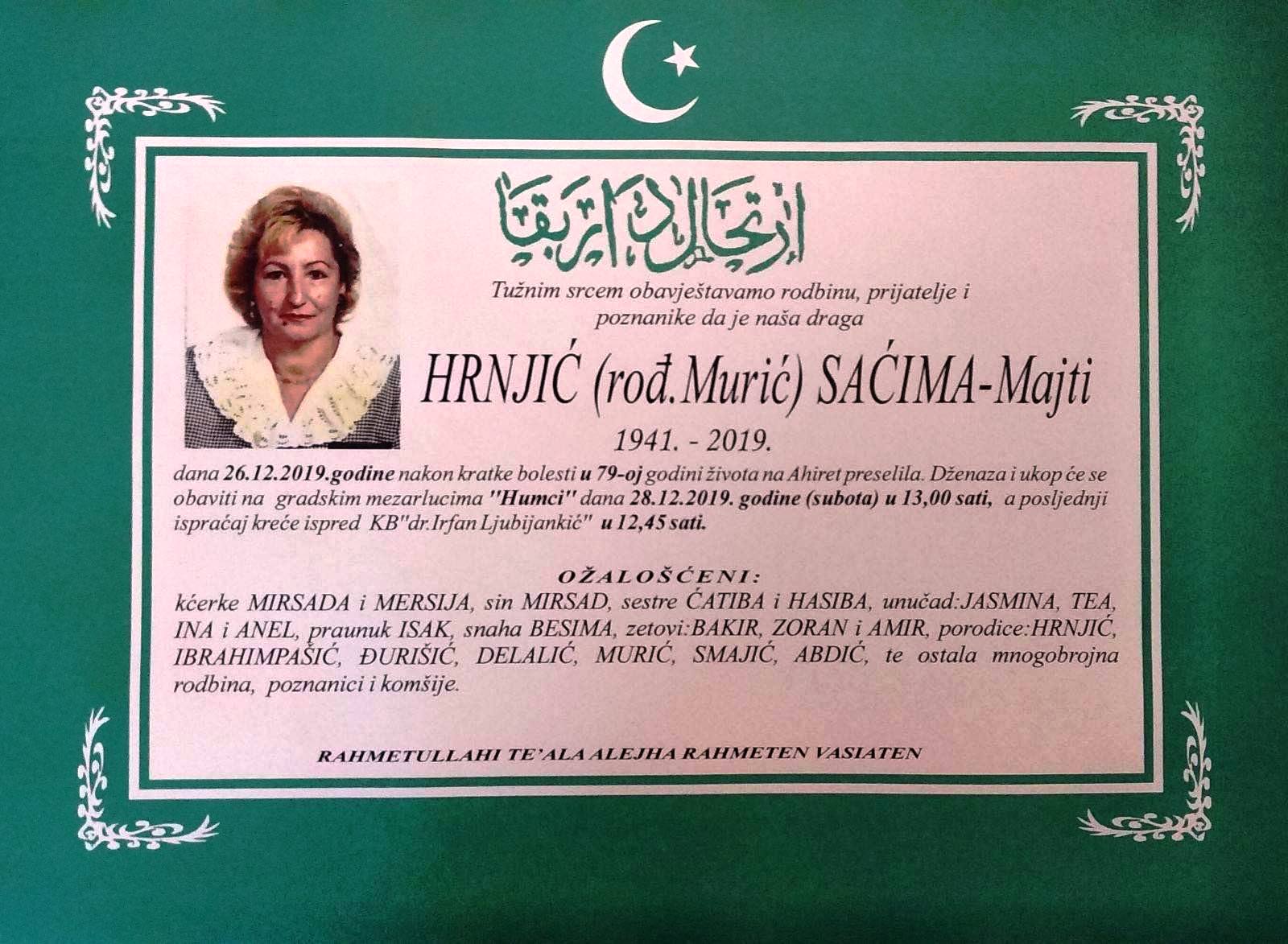 Dana 26.12.2019. godine u 79. godini života, na Ahiret je preselila Hrnjić (rođ. Murić) Saćima - Majti.