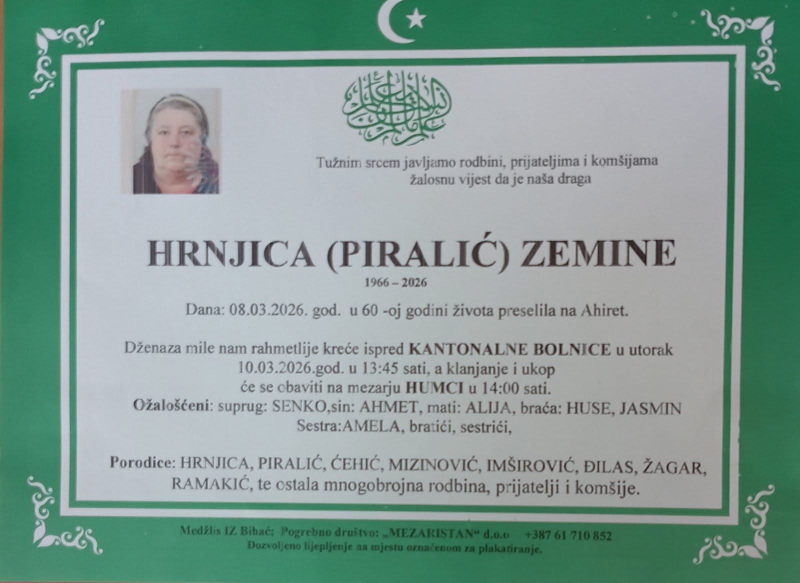 Dženaza mile nam rahmetlije kreće ispred Kantonalne bolnice u utorak 10.03.2026. godine u 13:45 sati, a klanjanje i ukop će se obaviti na mezarju Humci u 14:00 sati.