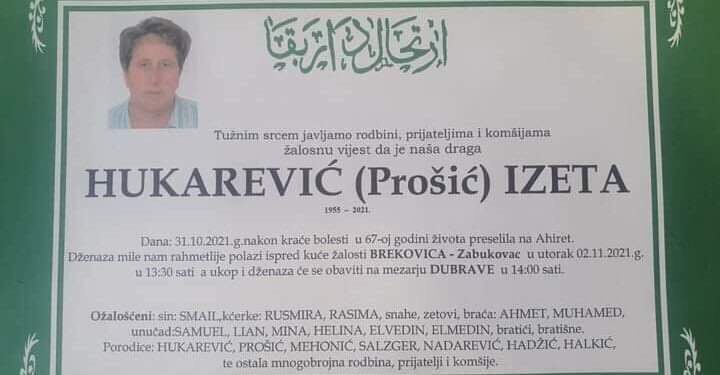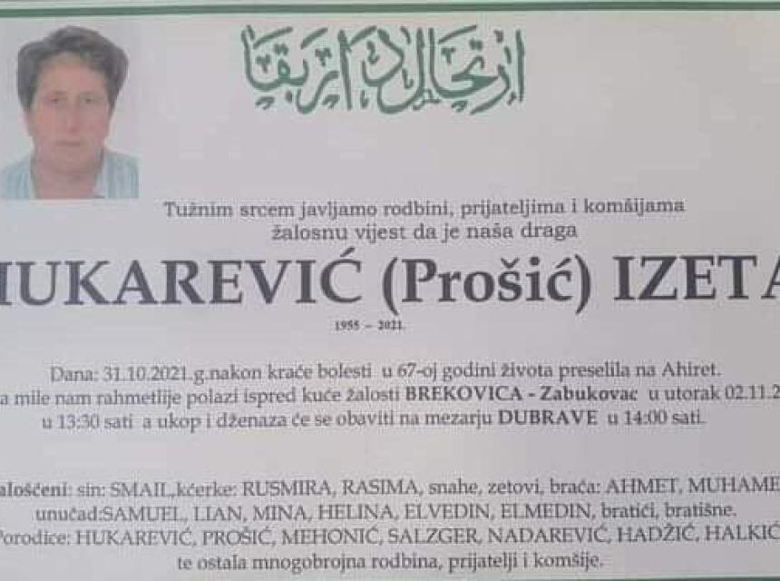 Tužnog srca i s bolom u duši obavještavamo rodbinu, komšije i prijatelje da je naša draga Hukarević (Prošić) Izeta, dana 31.10.2021. godine u 67-oj godini života, preselila na Ahiret.