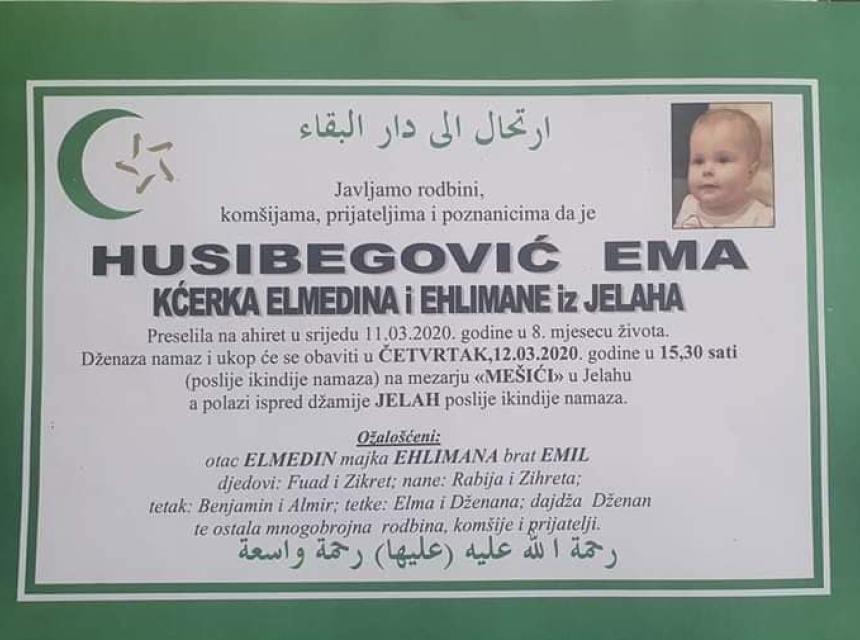 Tužnim srcem javljamo rodbini, prijateljima i komšijama da je dana 11.03.2020. god u 8.mjesecu života na Ahiret preselila Husibegović (Elmedin) Ema.