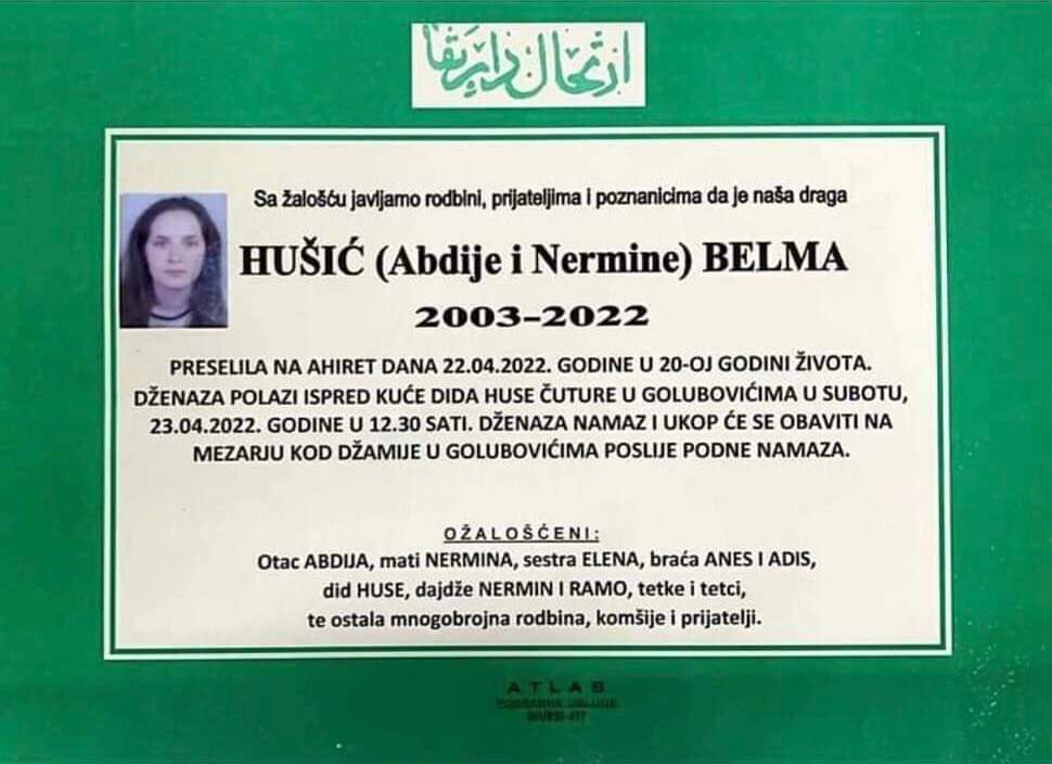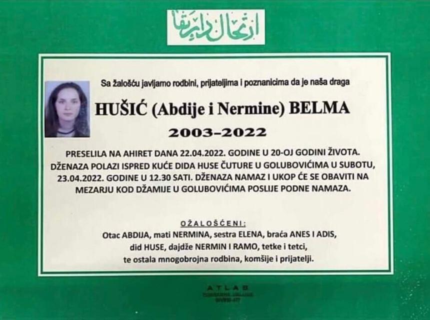 Tužnog srca i s bolom u duši obavještavamo rodbinu, komšije i prijatelje da je naša draga Hušić (Abdije i Nermine) Belma u 20. godini života preselila na Ahiret.
