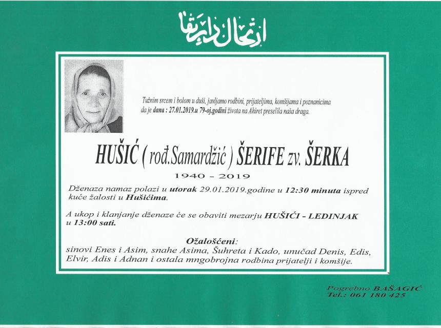 Javljamo rodbini, komšijama i prijateljima da je 27.01.2019.g. u 79.godini života na Ahiret preselila Hušić (rođ. Samardžić) Šerife zvana Šerka.