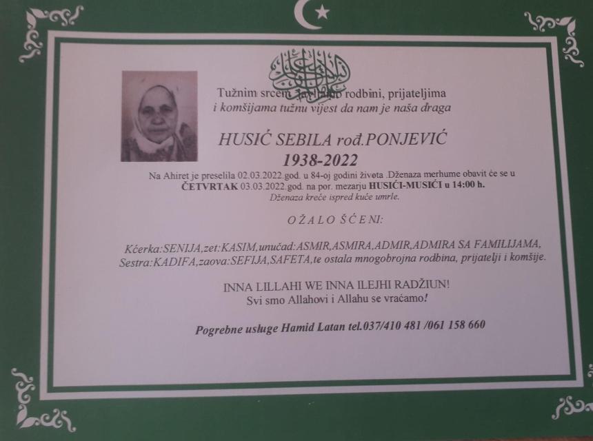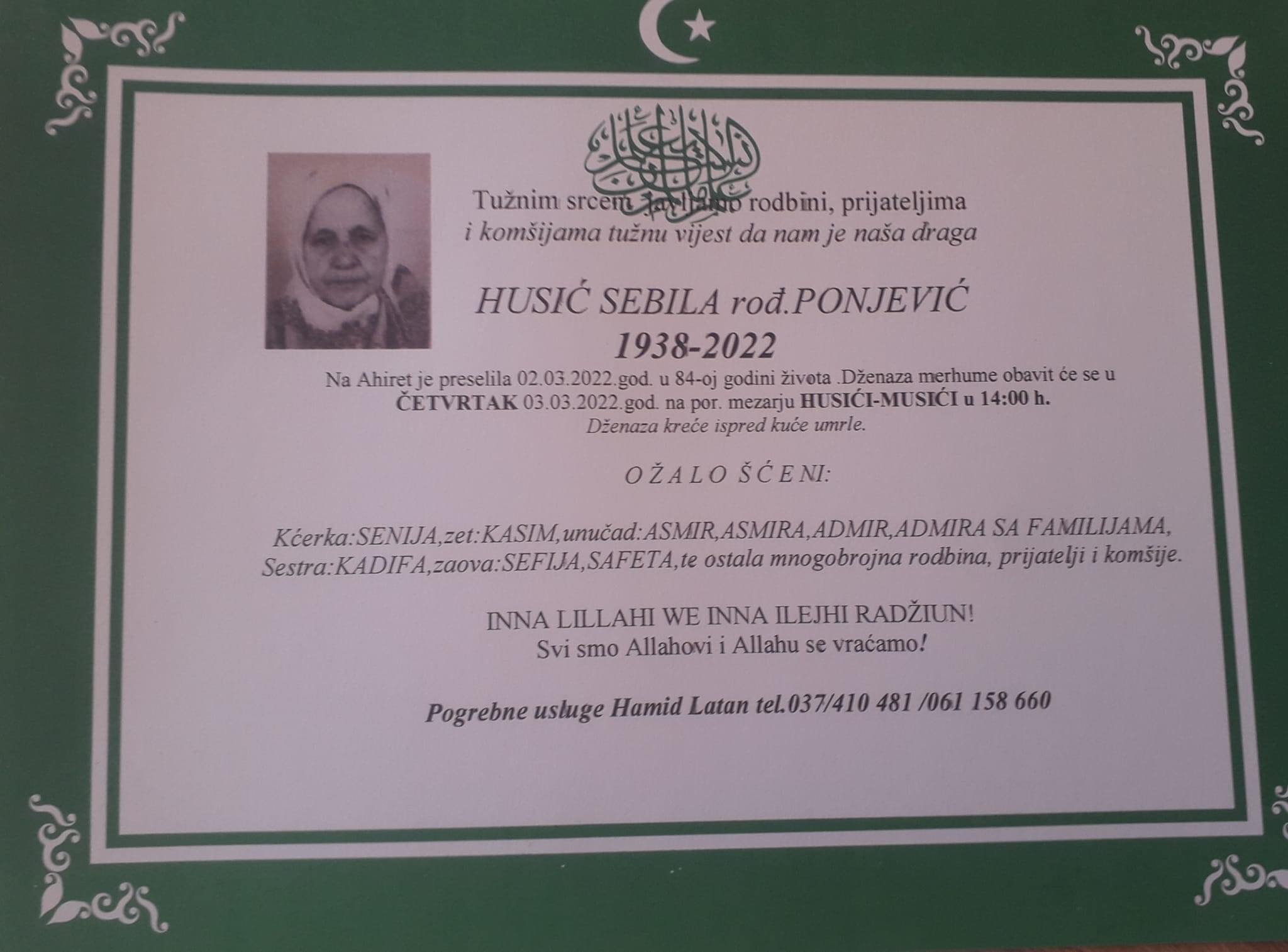 Tužnog srca i s bolom u duši obavještavamo rodbinu, komšije i prijatelje da je naša draga Husić Sebila rođ. Ponjević, dana 02.03.2022. godine, u 84-oj godini života, preselila na Ahiret.