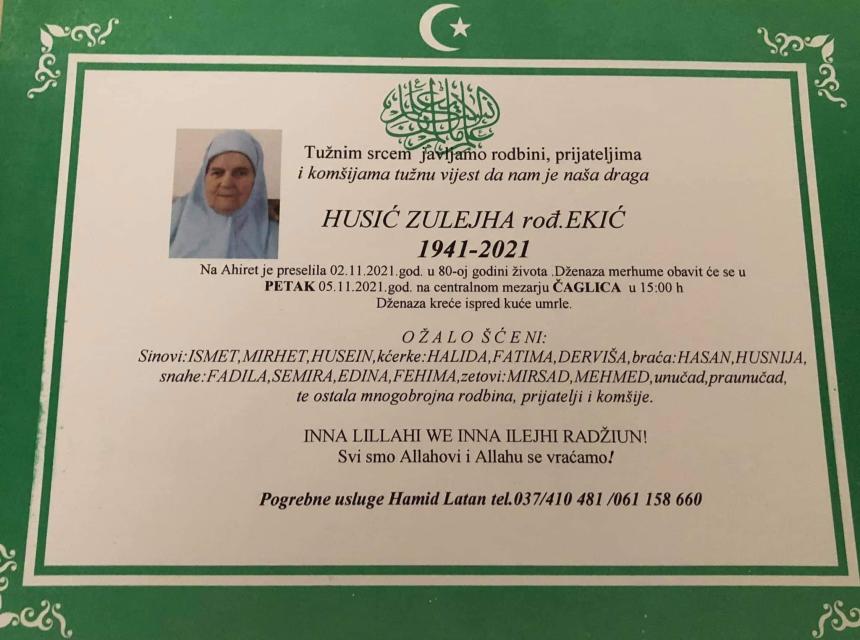 Tužnog srca i s bolom u duši obavještavamo rodbinu, komšije i prijatelje da je naša draga Husić Zulejha rođ. Ekić dana 02.11.2021. u 80. godini života preselila na ahiret.