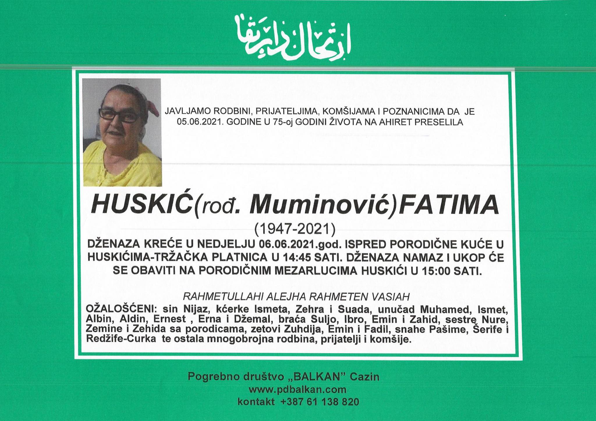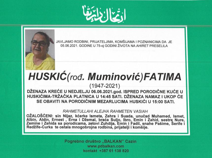 Tužnog srca i s bolom u duši obavještavamo rodbinu, komšije i prijatelje da je naša draga Huskić (rođ, Muminović) Fatima, dana 05.06.2021 godine, u 78-oj godini života, preselila na Ahiret.