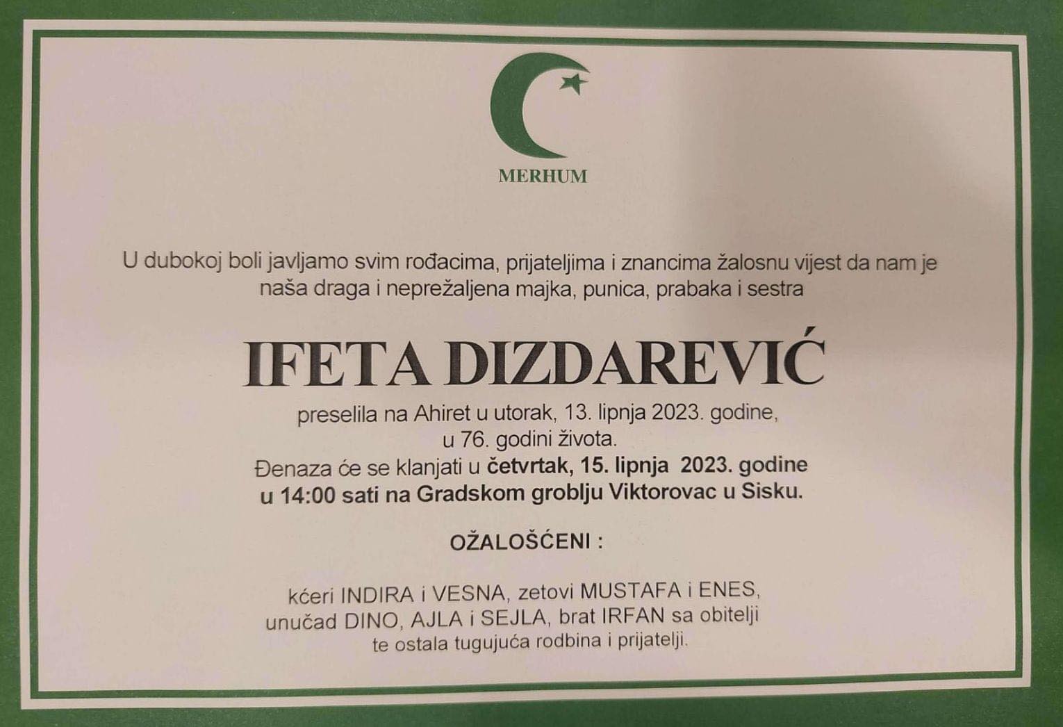 Džena namaz će se klanjati 15.06.2023. godine u četvrtak u 14 h na Gradskom groblju Viktorovac u Sisku