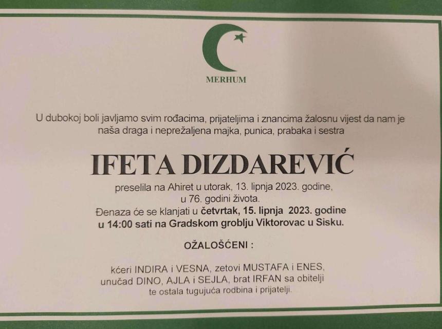 Ožalošćena porodica obavještava rodbinu, prijatelje i poznanike da je 13.06.2023. godine u 76-oj godini zivota na Ahiret preselila Dizdarević Ifeta