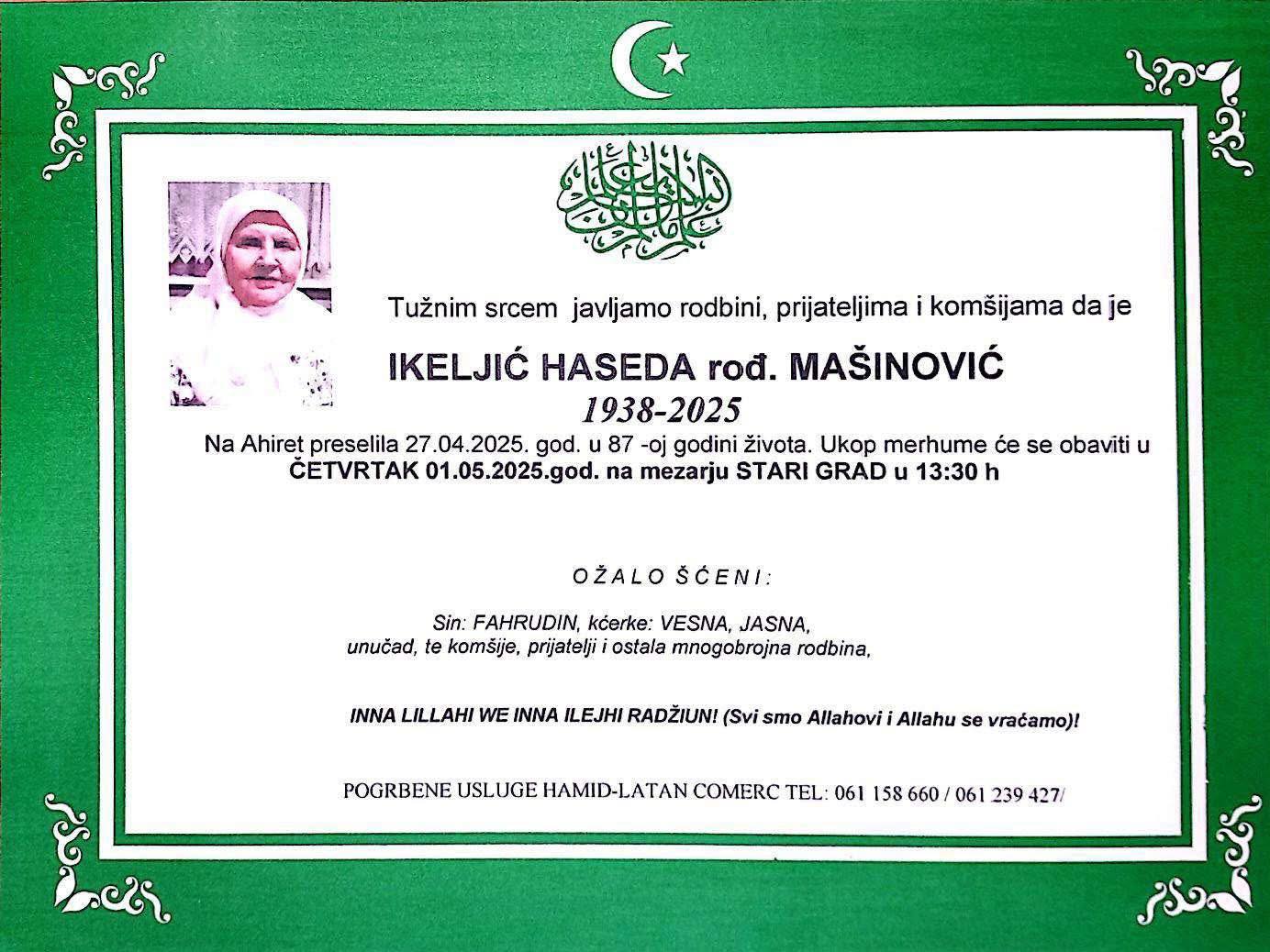 Ikeljić Haseda rođ. Mašinović na ahiret preselila 27.04.2025. godine, u 87-oj. godini života.