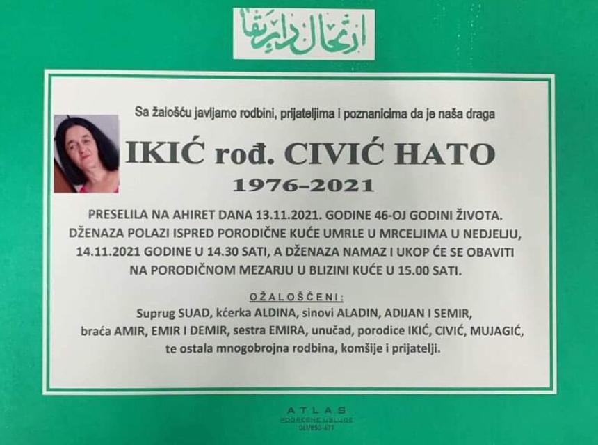 Tužnog srca i s bolom u duši obavještavamo rodbinu, komšije i prijatelje da je naša draga Ikić Hato, dana 13.11.2021. godine, u 46-oj godini života, preselila na Ahiret.