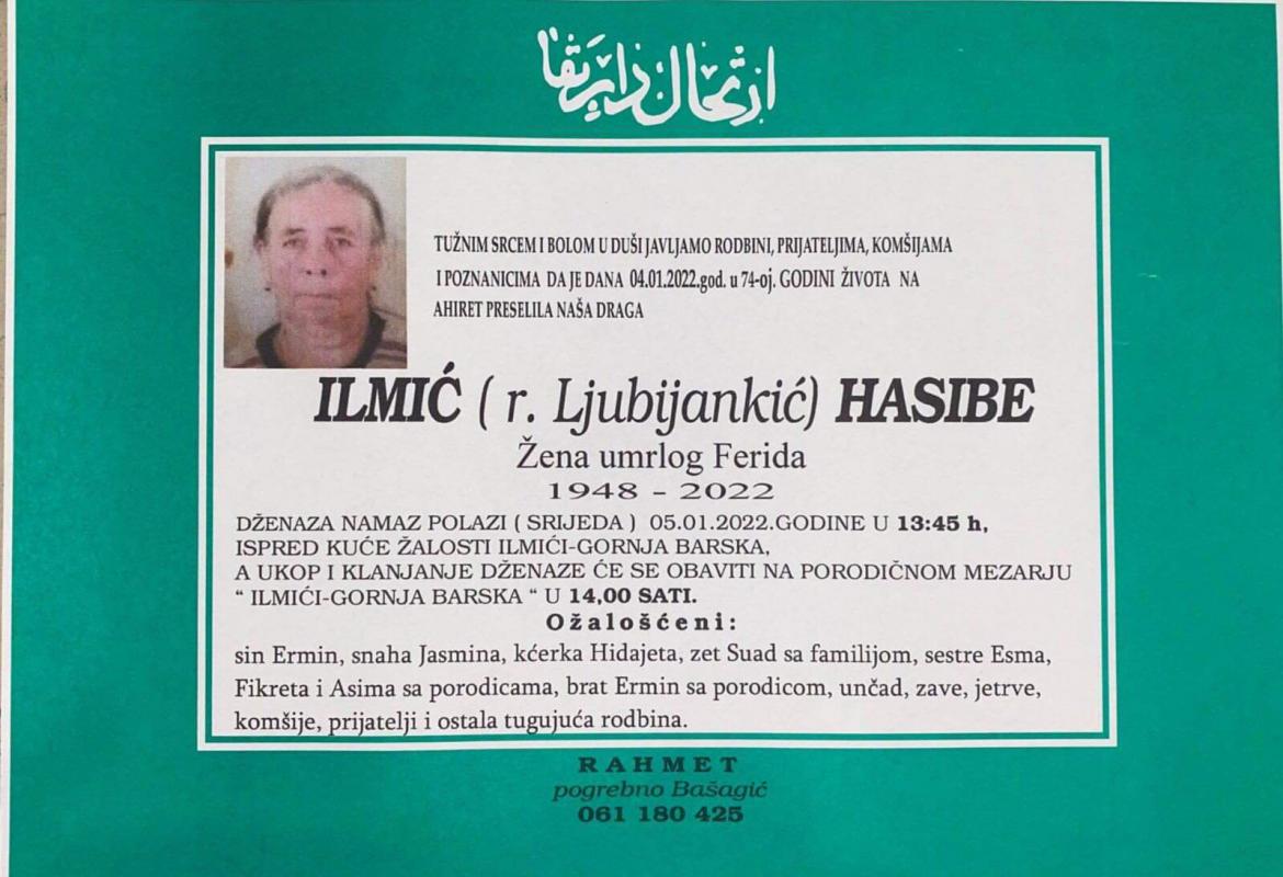 Tužnog srca i s bolom u duši obavještavamo rodbinu, komšije i prijatelje da je naša draga Ilmić (rođ. Ljubijankić) Hasibe dana 04.01.2022. u 74. godini života preselila na ahiret.
