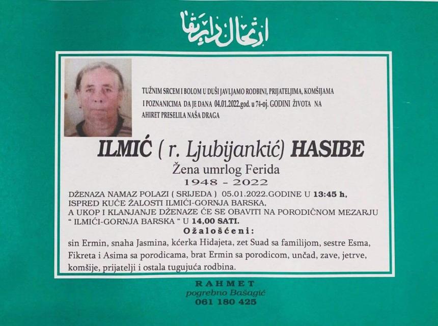 Dženaza namaz polazi u srijedu 05.1.2022., u 13:45h, ispred kuće žalosti Ilmići - Gornja Barska. Ukop i klanjanje dženaze će se obaviti na porodičnom mezarju "Ilmići - Gornja Barska" u 14:00h.