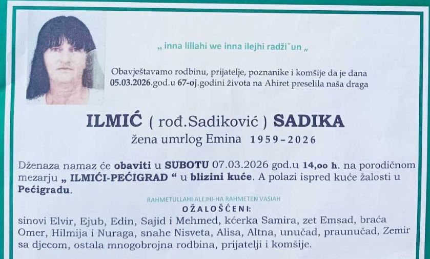 Dženaza namaz će obaviti u SUBOTU 07.03.2026 god.u 14,00 h. na porodičnom mezarju,, ILMIĊI-PEĆIGRAD " u blizini kuće. A polazi ispred kuće žalosti u