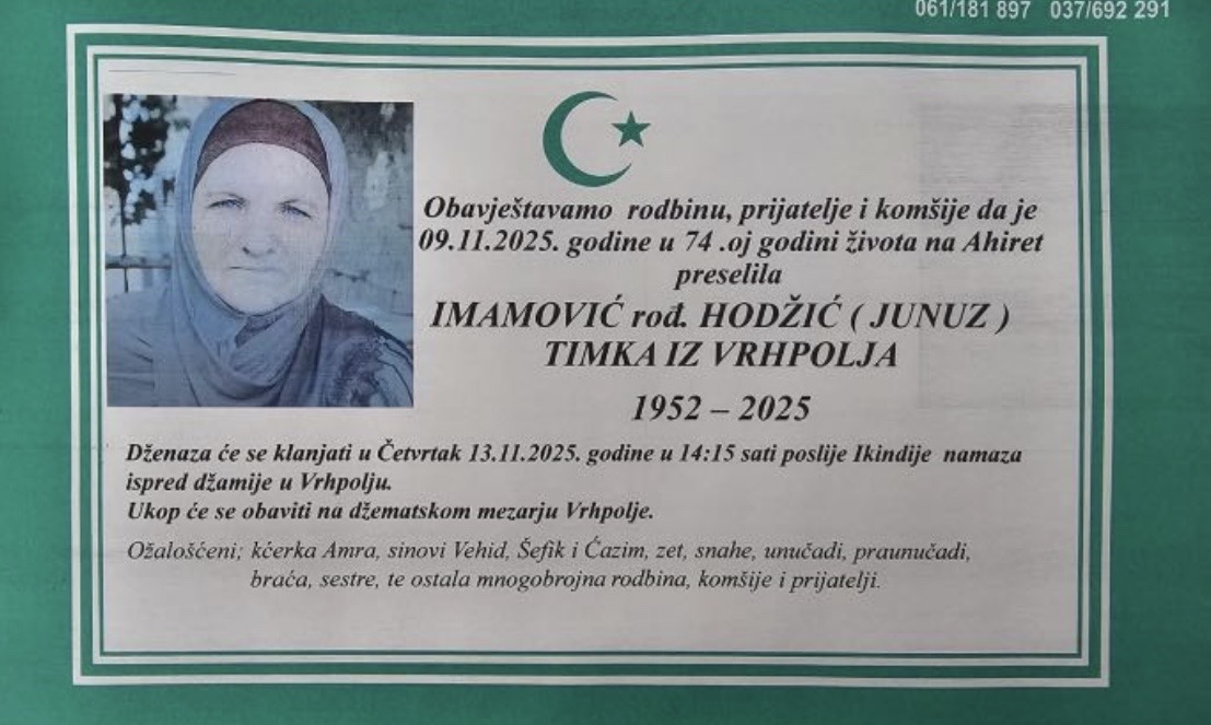 Dženaza će se klanjati u četvrtak, 13.11.2025. godine u 14:15 sati poslije ikindije namaza