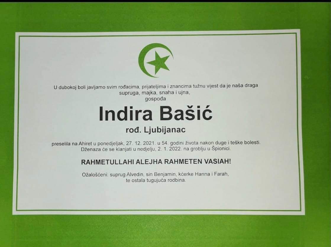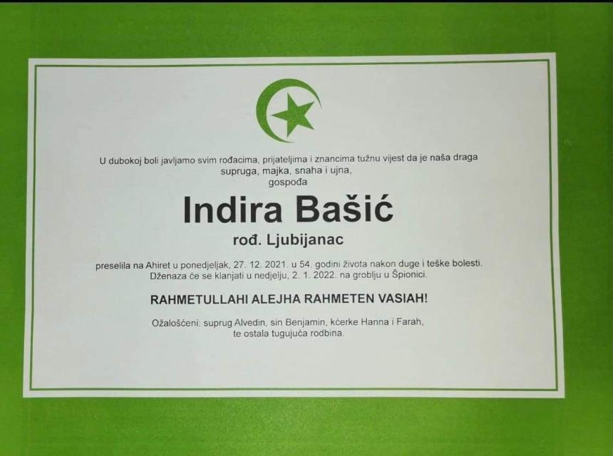 Tužnog srca i s bolom u duši obavještavamo rodbinu, komšije i prijatelje da je naša draga Indira Bašić dana 27.12.2021. u 54. godini života preselila na ahiret.