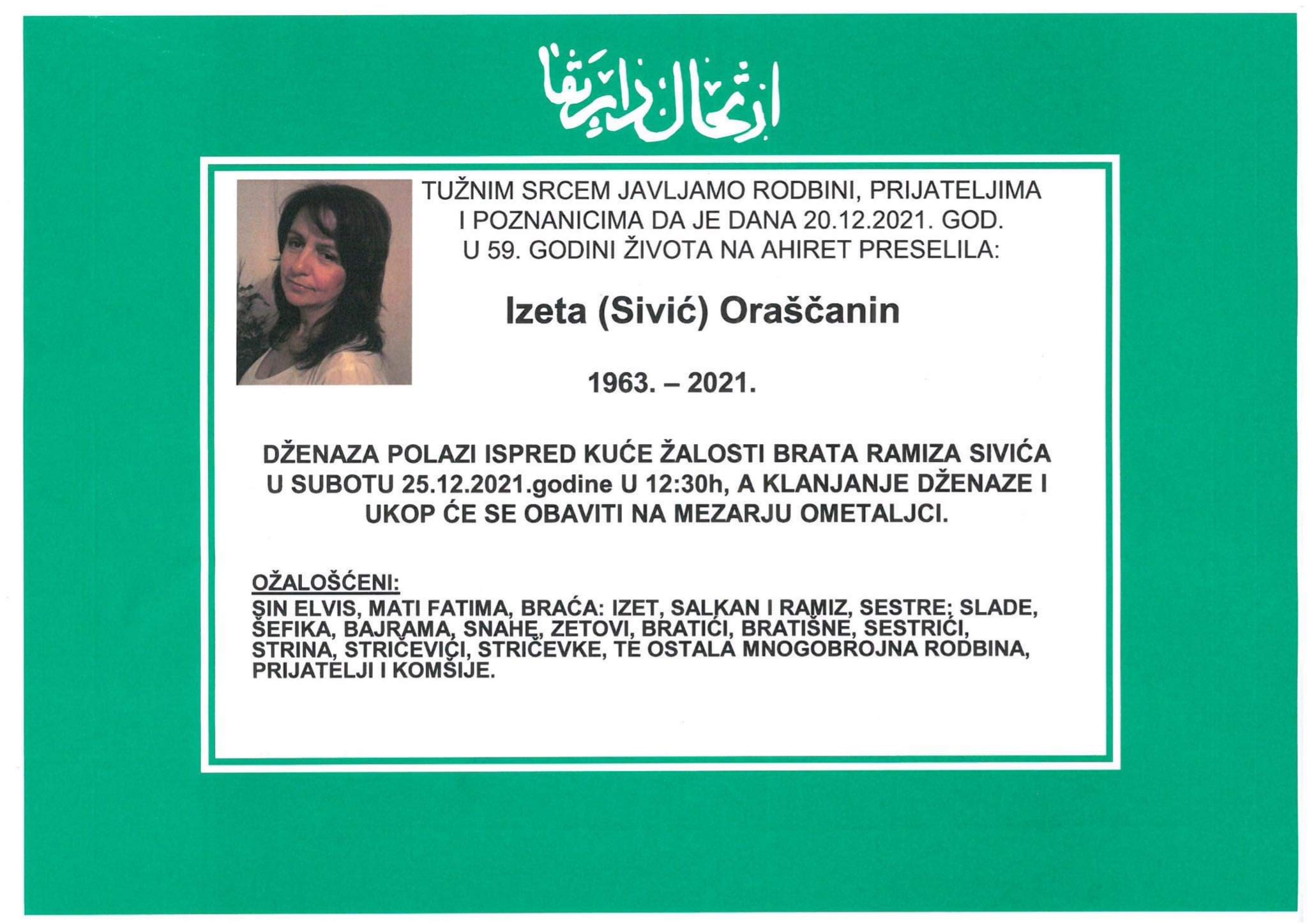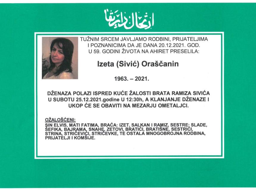 Tužnog srca i s bolom u duši obavještavamo rodbinu, komšije i prijatelje da je naša draga Izeta (Sivić) Oraščanin dana 20.12.2021. u 59. godini života preselila na ahiret.