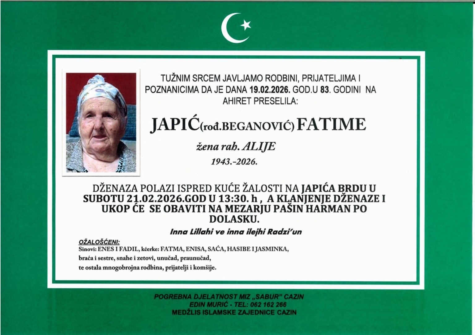 Dženaza polazi ispred kuće žalosti na Japića Brdu u subotu, 21.02.2026. godine u 13:30 sati, a klanjanje dženaze i ukop obavit će se na mezarju Pašin Harman po dolasku.