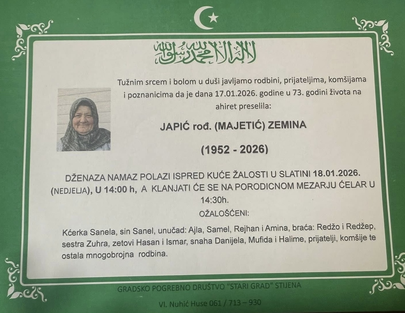 Dženaza-namaz polazi ispred kuće žalosti u Slatini, 18.01.2026. godine (nedjelja) u 14:00 sati, a klanjat će se na porodičnom mezarju Ćelar u 14:30 sati.