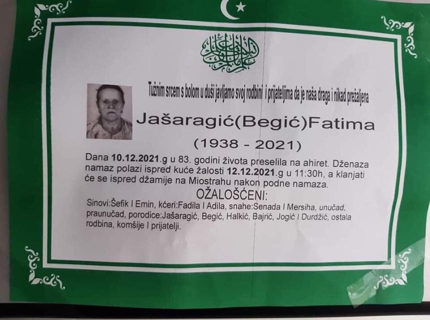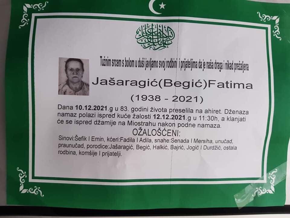 Tužnog srca i s bolom u duši obavještavamo rodbinu, komšije i prijatelje da je naša draga Jašaragić (rođ. Begić) Fatima dana 10.12.2021. u 83. godini života preselila na Ahiret.