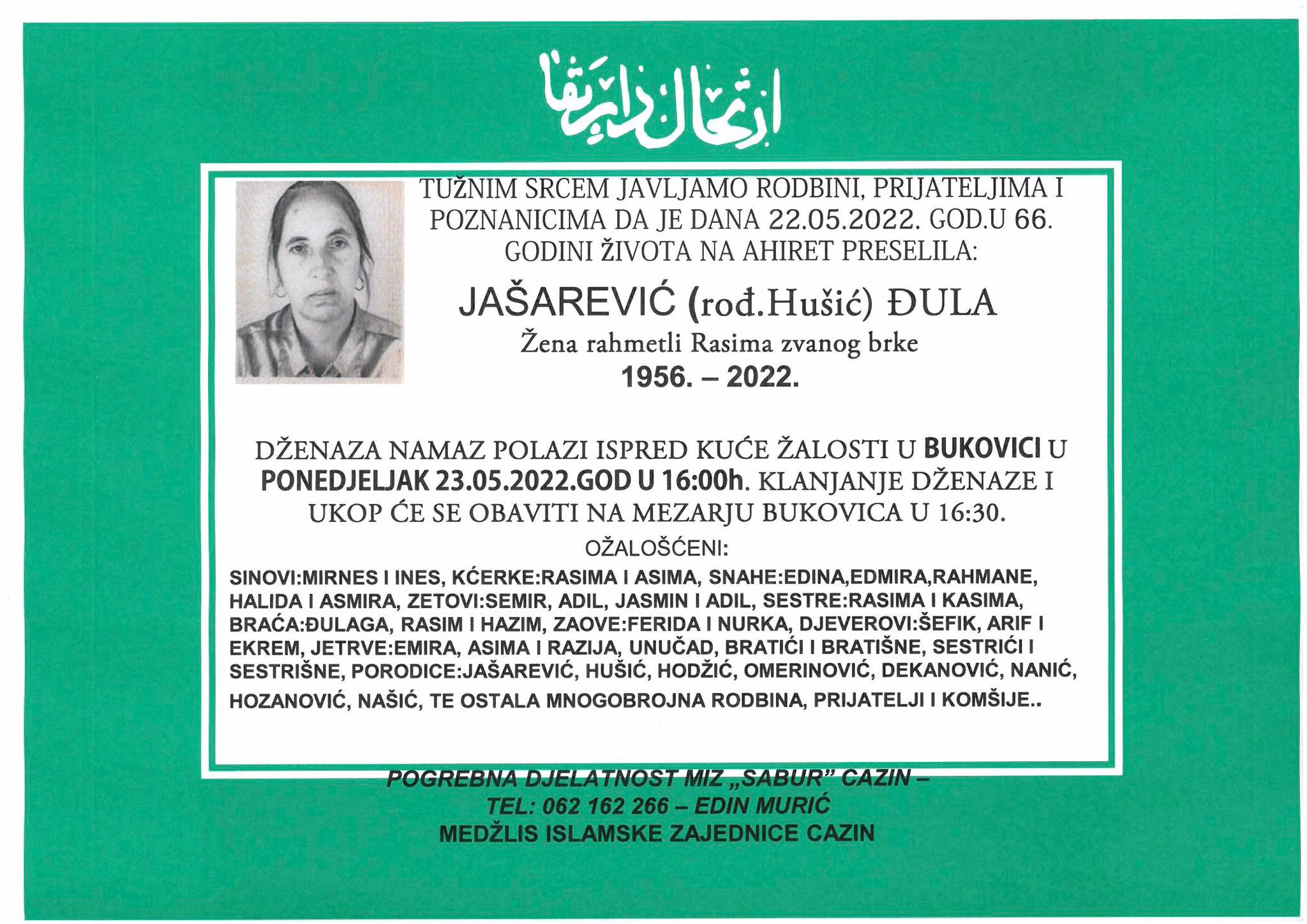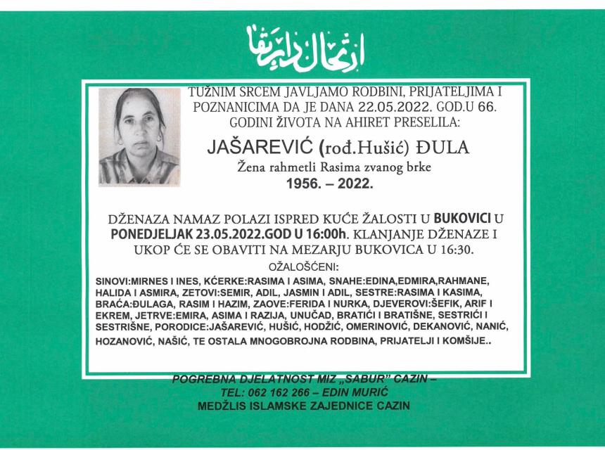 Tužnog srca i s bolom u duši obavještavamo rodbinu, komšije i prijatelje da je naša draga Jašarević (rođ. Hušić) Đula u 66. godini života preselila na Ahiret.
