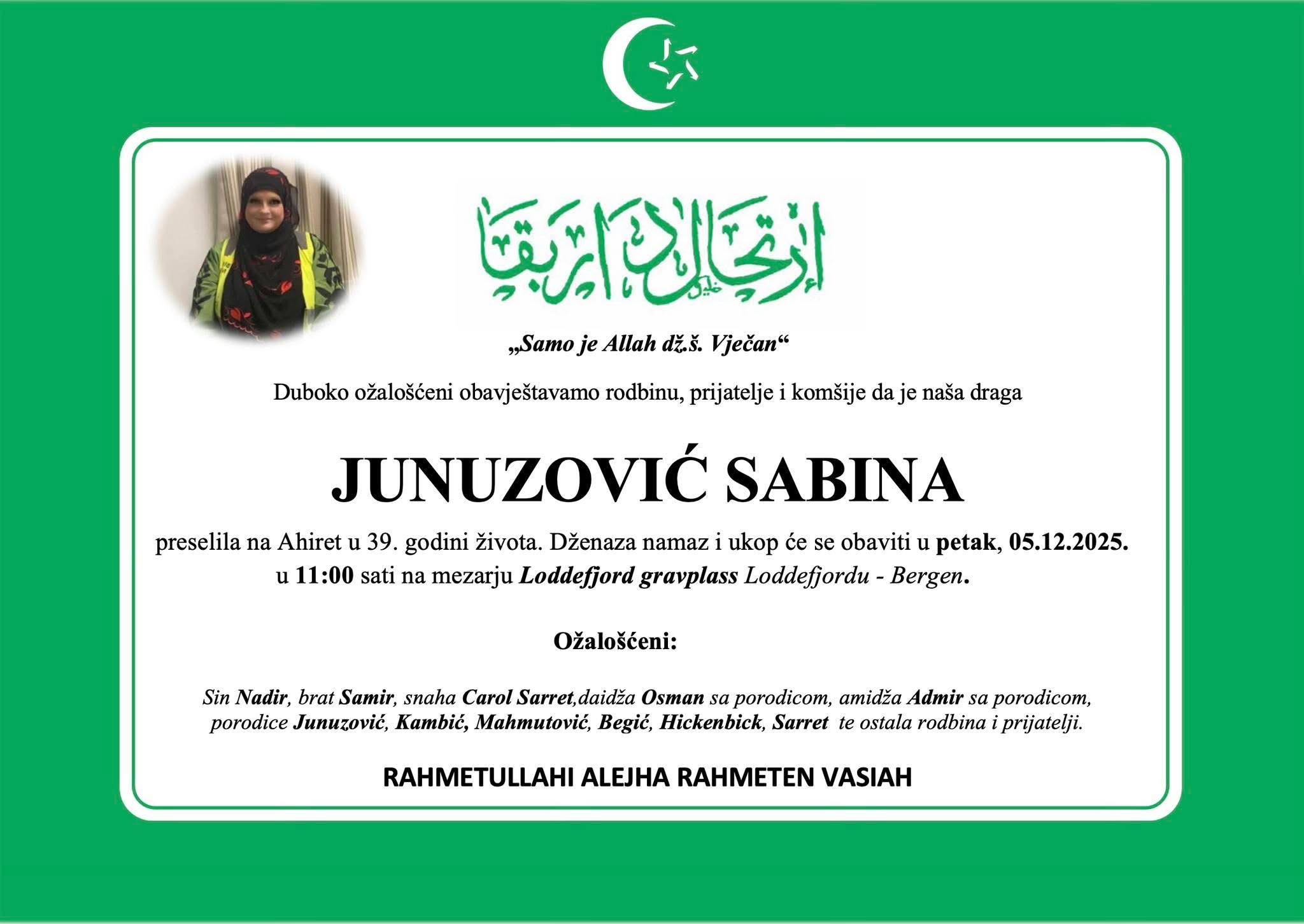 Dženaza namaz i ukop će se obaviti u petak, 05.12.2025. u 11:00 sati na mezarju Loddefjord gravplass Loddefjordu – Bergen.