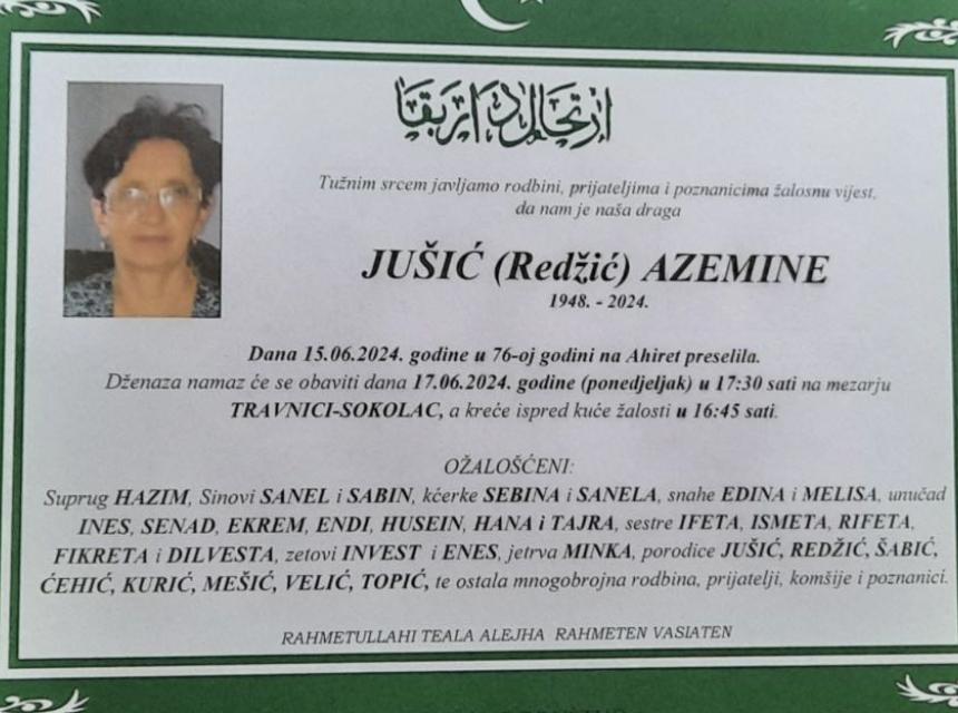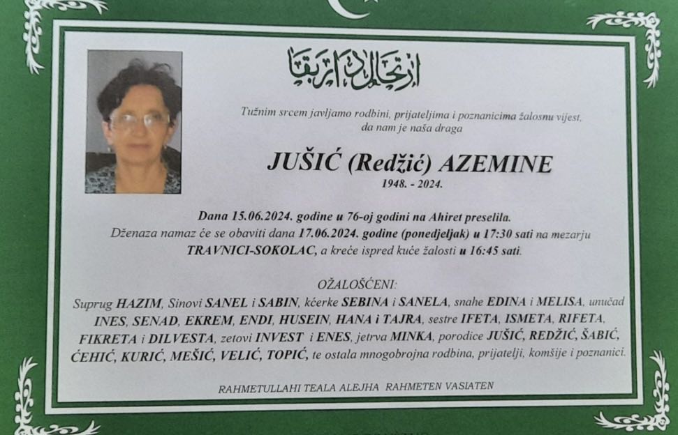 OBAVIJEST O SMRTI 16 Jun, 2024 - 15:09 / Uredio: AlmaK. / 0 Comments Na ahiret preselila Jušić Azemine Tužnim srcem obavještavamo rodbinu, prijatelje i komšije da je preselila Azemine Jušić. Dženaza će se obaviti sutra na mezarju Sokolac, u 17.30 sati. Neka joj je vječni rahmet, a porodici sabur. obavijesti o smrti Related Articles OBAVIJEST O SMRTI 05 Dec, 2025 Na Ahiret preselila Smlatić (Mulalić) Vahida OBAVIJEST O SMRTI 05 Dec, 2025 Na Ahiret preselila hadži Sebila (Bajraktarević) Ćaušević OBAVIJEST O SMRTI 05 Dec, 2025 Na Ahiret preselila Prasko (Velid) Edina OBAVIJEST O SMRTI 05 Dec, 2025 Na Ahiret preselila Handanagić (rođ. Durić) Esada–Enesa OBAVIJEST O SMRTI 05 Dec, 2025 Na Ahiret preselila Kapić (rođ. Abdić) Fatima OBAVIJEST O SMRTI 05 Dec, 2025 Na Ahiret preselila Nuhanović (Čazima) Sabina