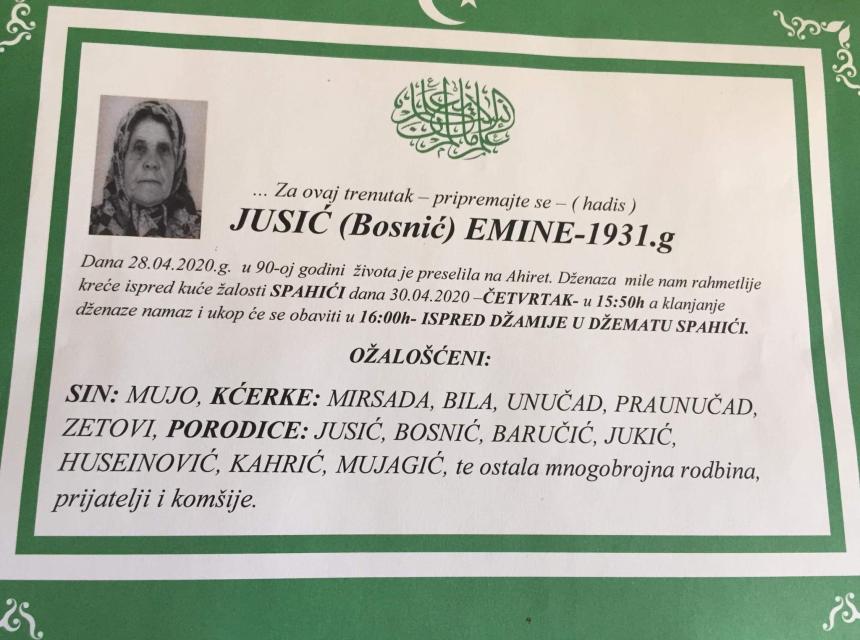 Tužnim srcem i bolom u duši javljamo rodbini i prijateljima da je naša draga i nikad prežaljena Jusić (Bosnić) Emine dana 28.04.2020. godine u 90-oj godini života preselila na Ahiret.