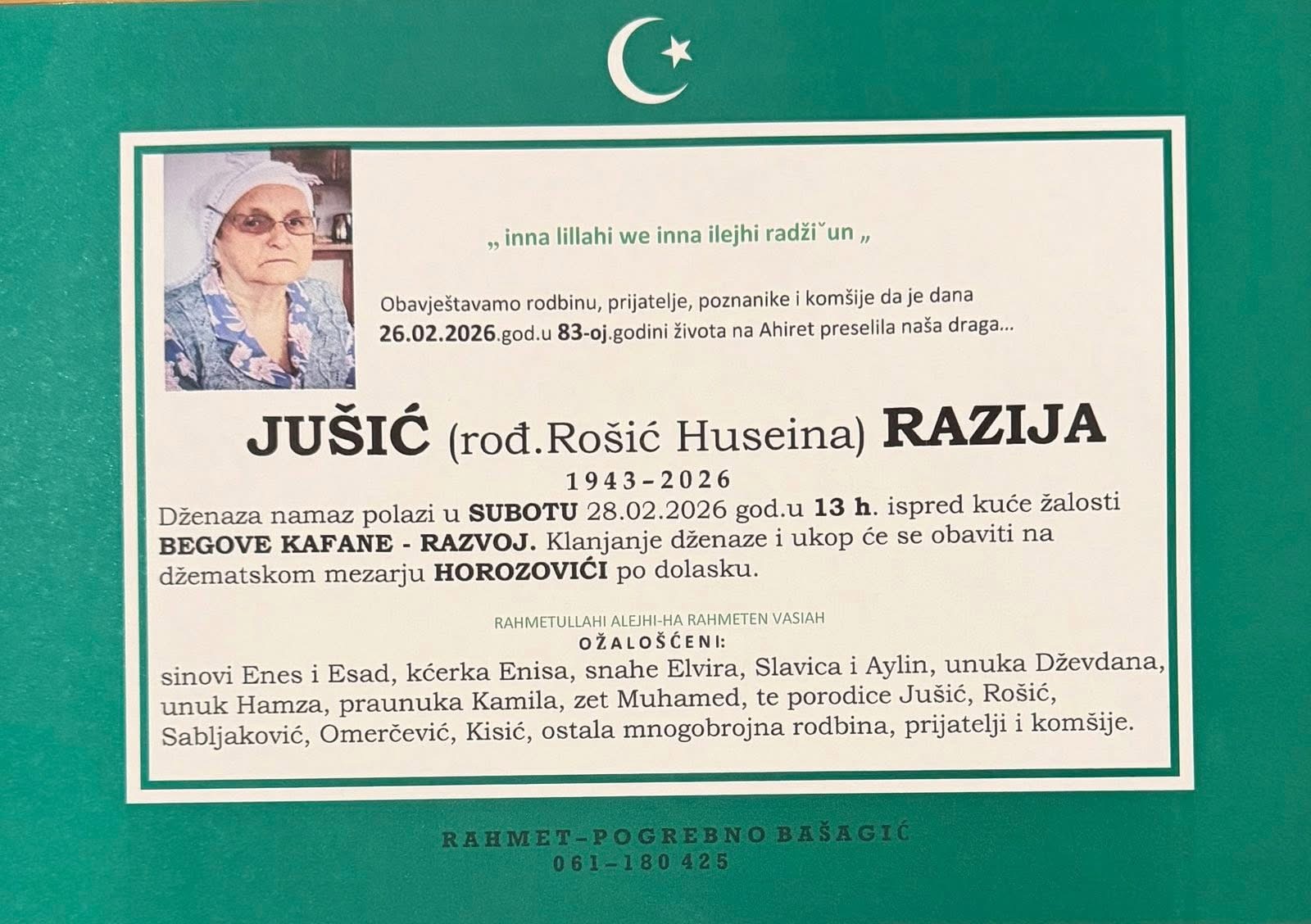 Dženaza-namaz polazi u subotu, 28. 02. 2026. godine u 13 h ispred kuće žalosti Begove kafane – Razvoj. Klanjanje dženaze i ukop obavit će se na džematskom mezarju Horozovići po dolasku.