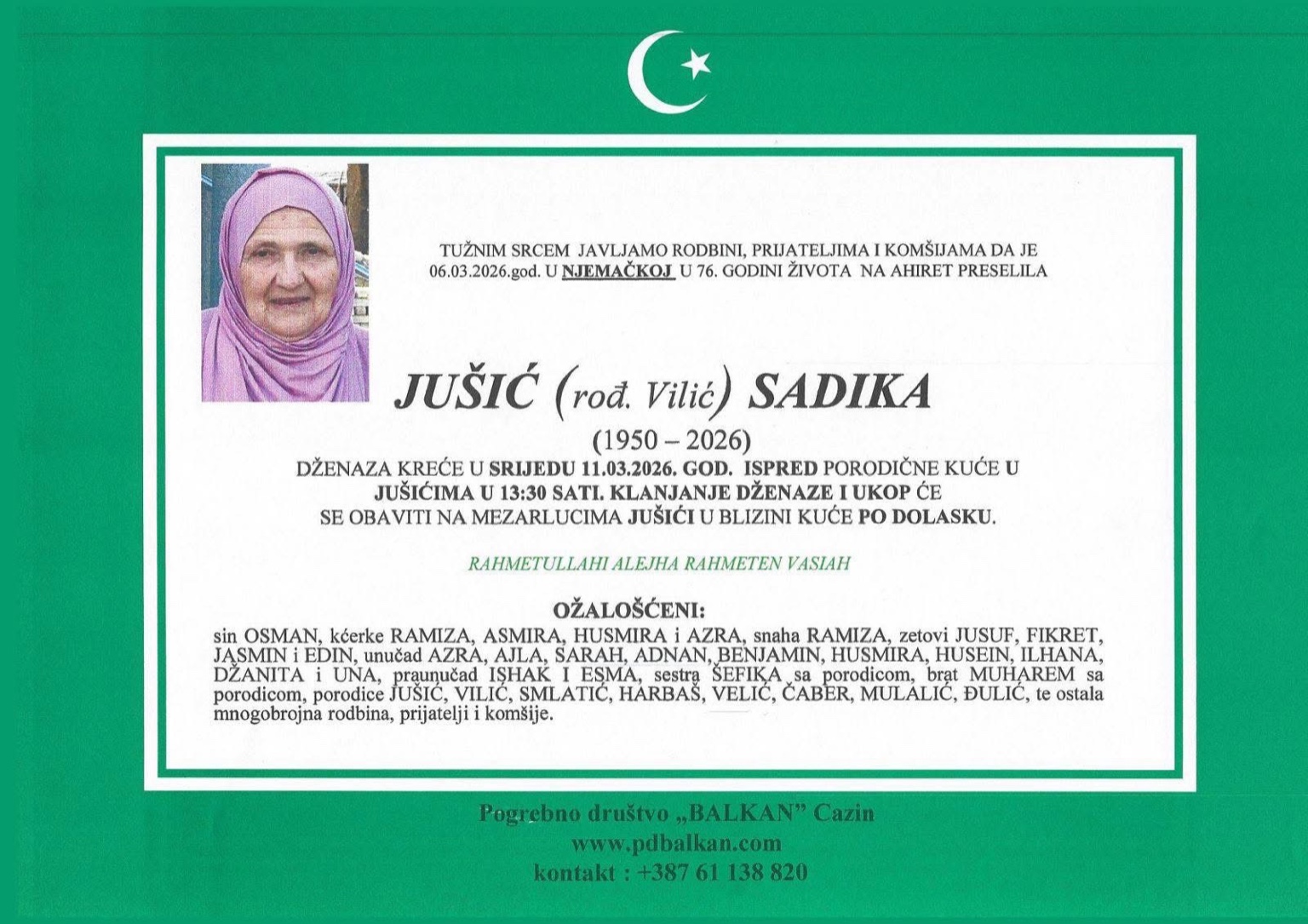 Dženaza kreće u srijedu 11.03.2026. godine ispred porodične kuće u Jušićima u 13:30 sati.