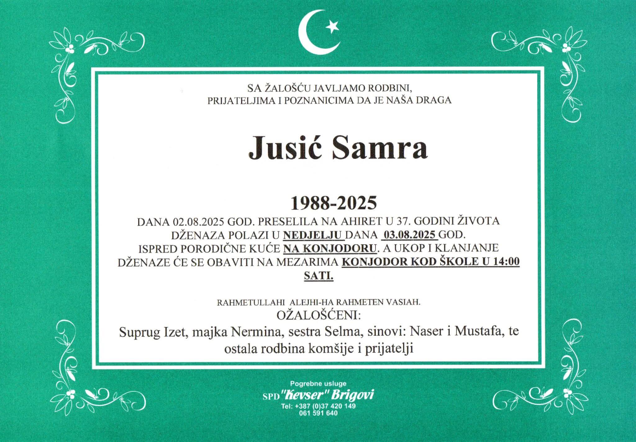 SA ŽALOŠĆU JAVLJAMO RODBINI, PRIJATELJIMA I POZNANICIMA DA JE NAŠA DRAGA Jusić Samra DANA 02.08.2025 GOD. PRESELILA NA AHIRET U 37. GODINI ŽIVOTA.